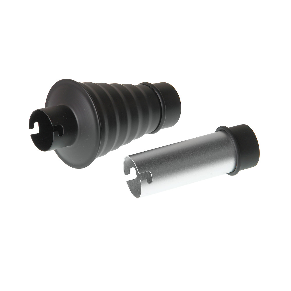 Комплект состоит из двух насадок: конической и цилиндрической. В комплект входят две съемные сотовые насадки – для создания более «жесткого» света.