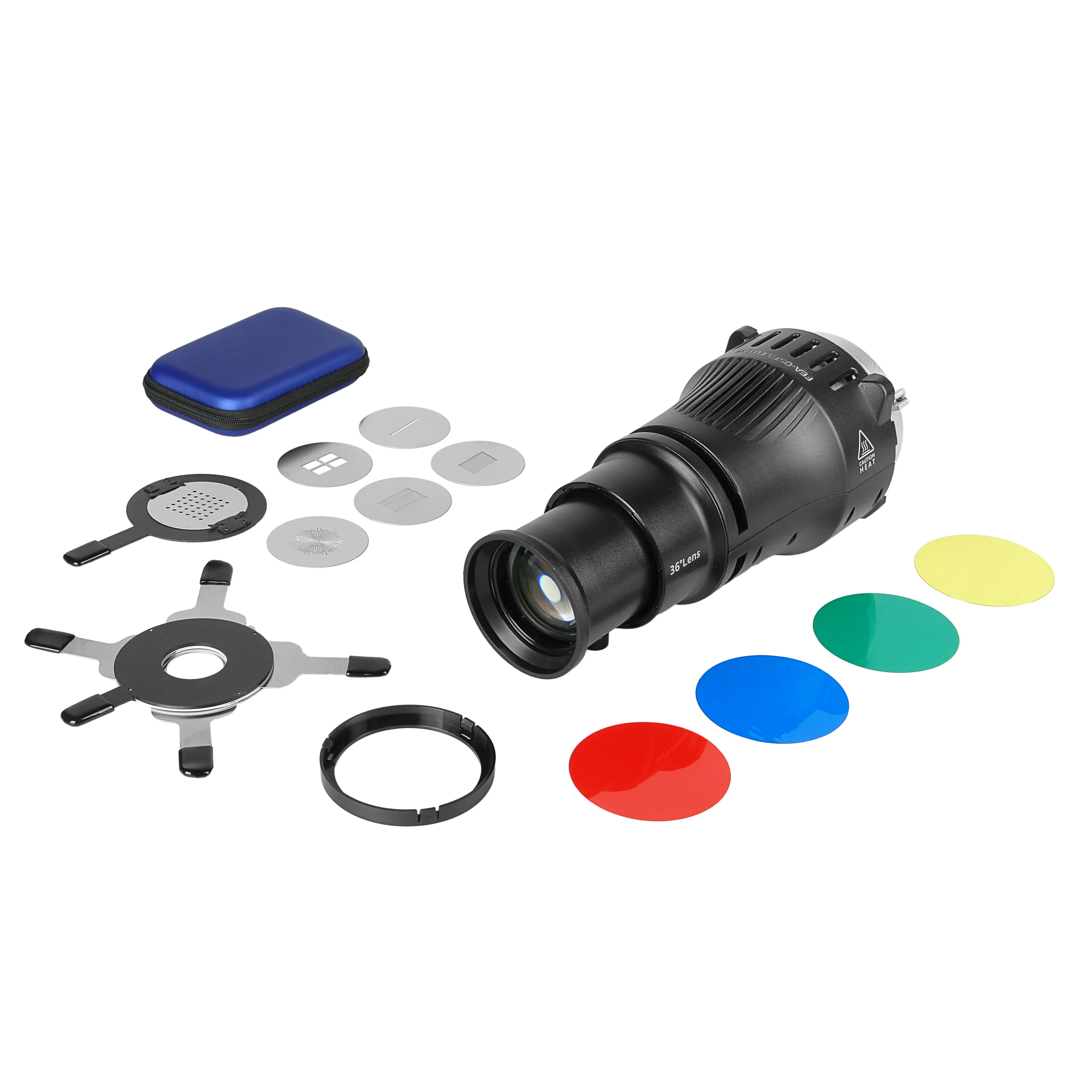 Оптическая насадка FEA-OST7F BW создает акцентированное и управляемое освещение от источника света с минимальными потерями мощности. Устанавливается на импульсный осветитель с байонетом Bowens мощностью до 1200 Дж. Комплект включает шторки, цветные фильтры и набор масок Gobo для создания сложных световых эффектов.