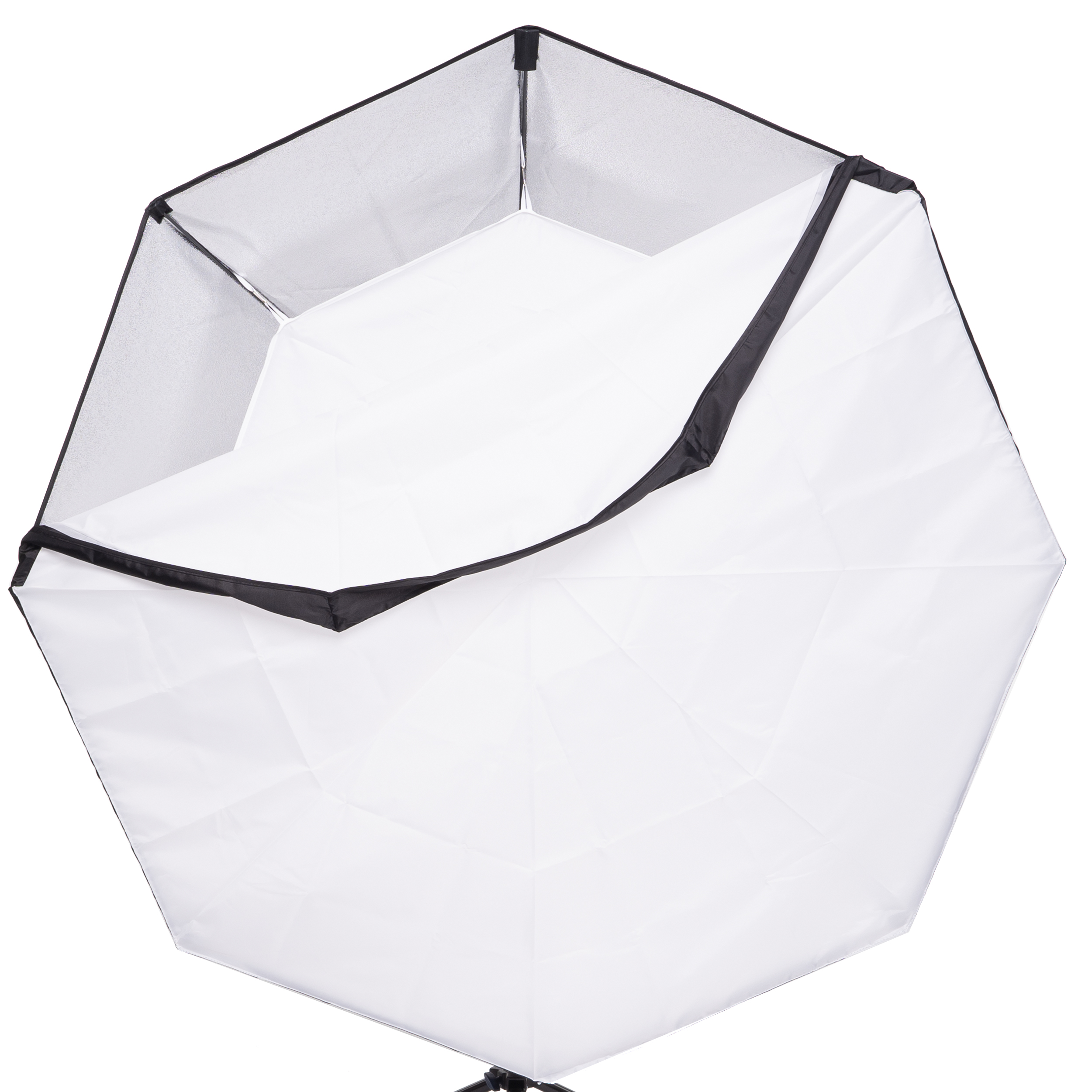 Октобокс помогает создать мягкое рассеянное освещение, предотвращая появление глубоких теней или бликов. Закрытая конструкция позволяет получить равномерный направленный поток света и избежать нежелательных потерь светового потока. Софтбоксы дают «живой» блик в глазах и на поверхностях объекта, имитирующий естественное освещение.