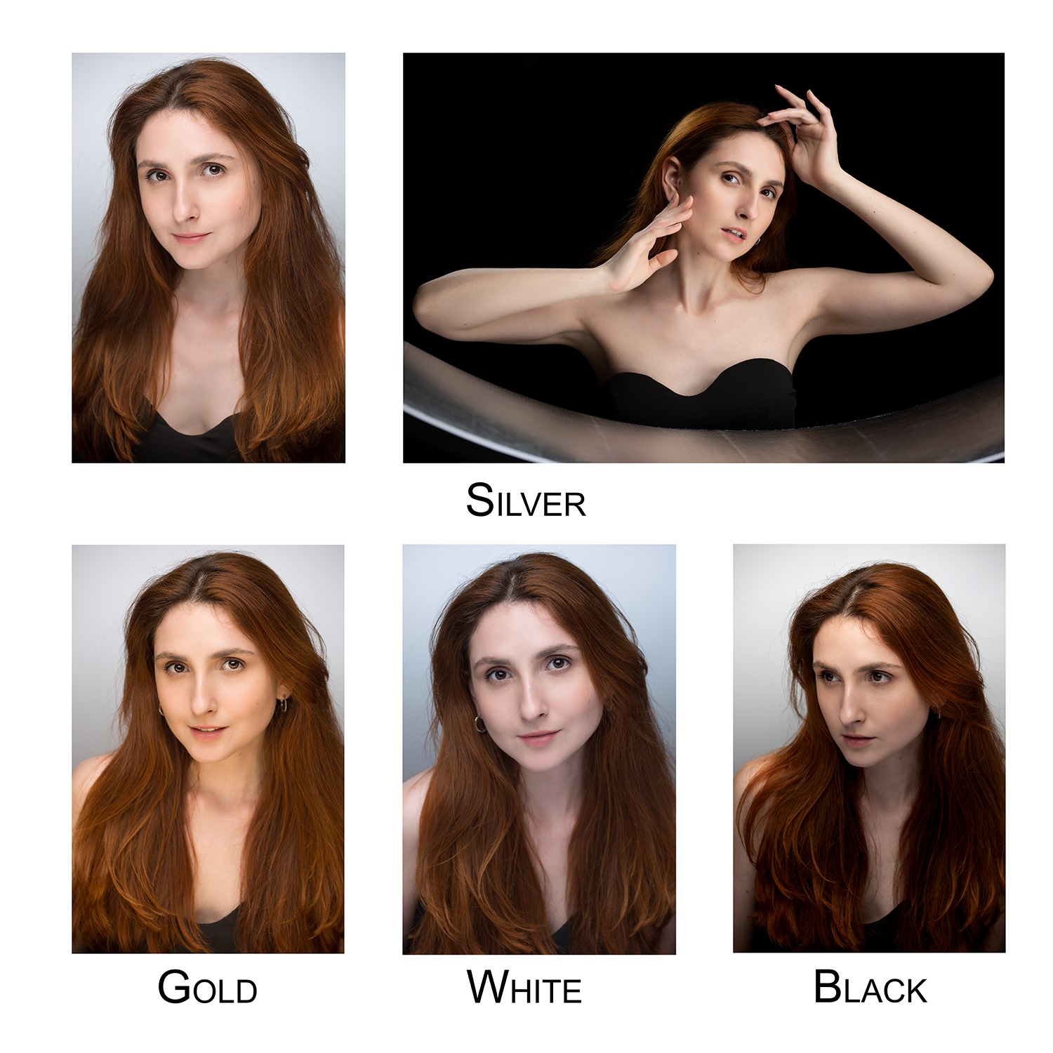 - Два двухсторонних тканевых отражателя – 4 цвета (черный/серебристый, белый /золотой) для 4 визуальных эффектов