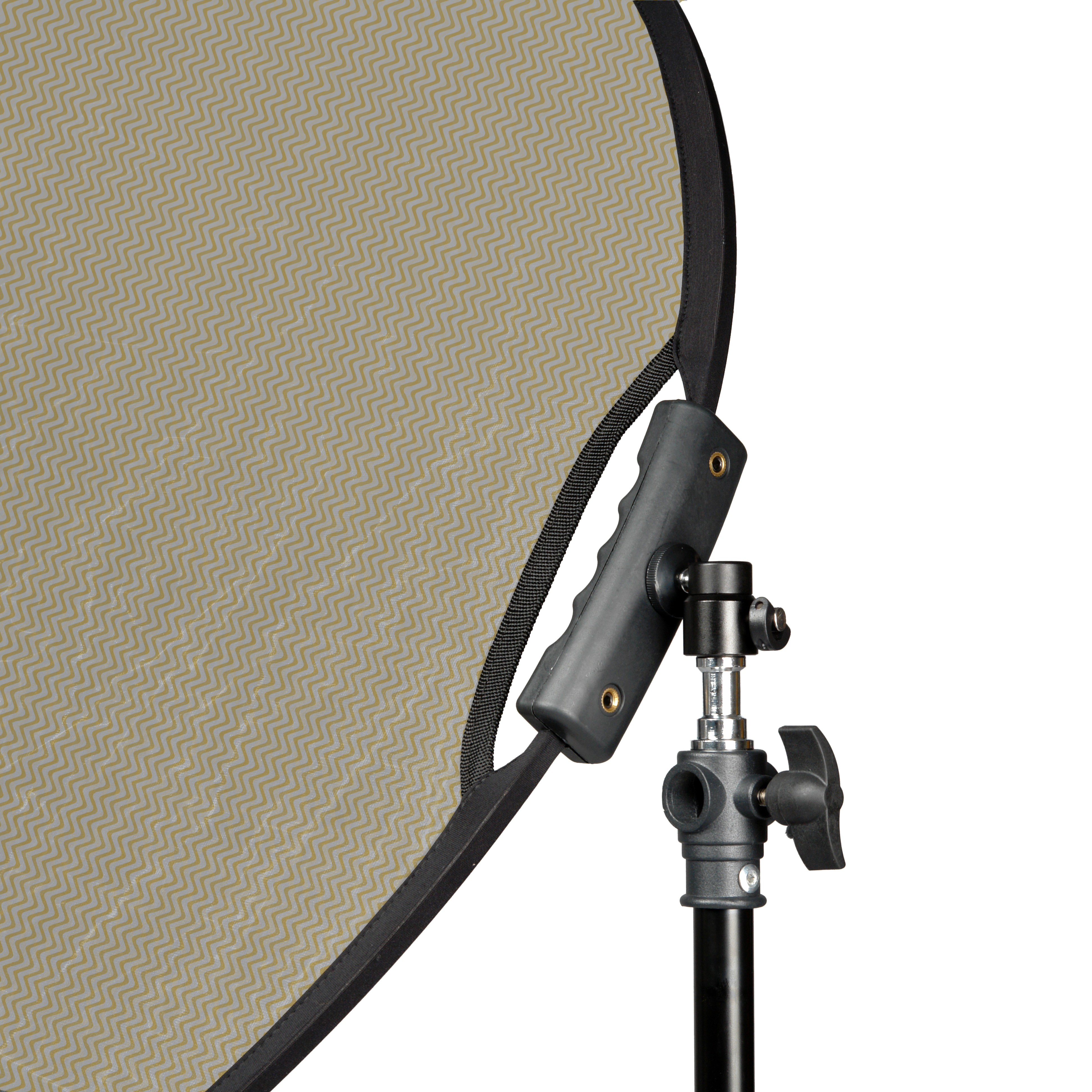 Стальной упругий каркас прошит по периметру капроновым карманом, диаметр отражателя в сложенном виде – 30 см. Две рукоятки, закрепленные на каркасе, оборудованы отверстиями с резьбой 1/4", что позволяет закрепить отражатель на штативах или любых опорах без использования специального держателя.