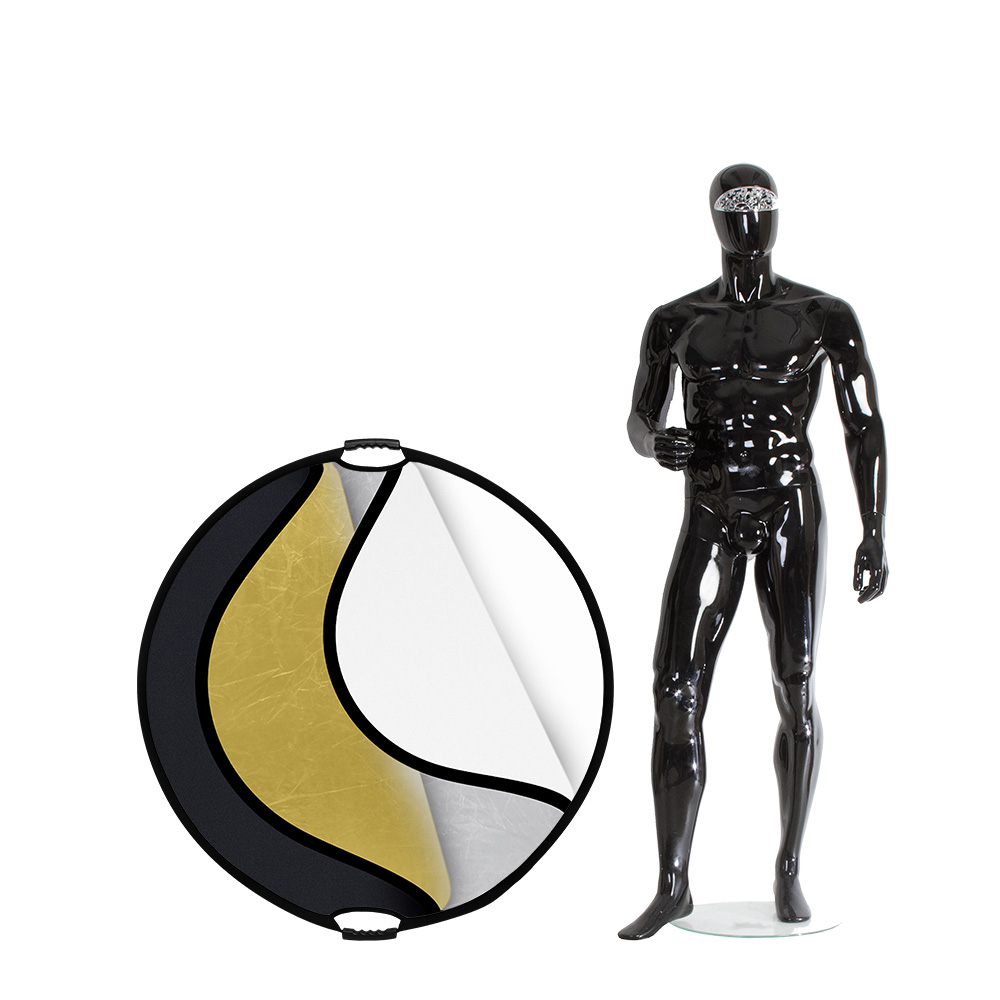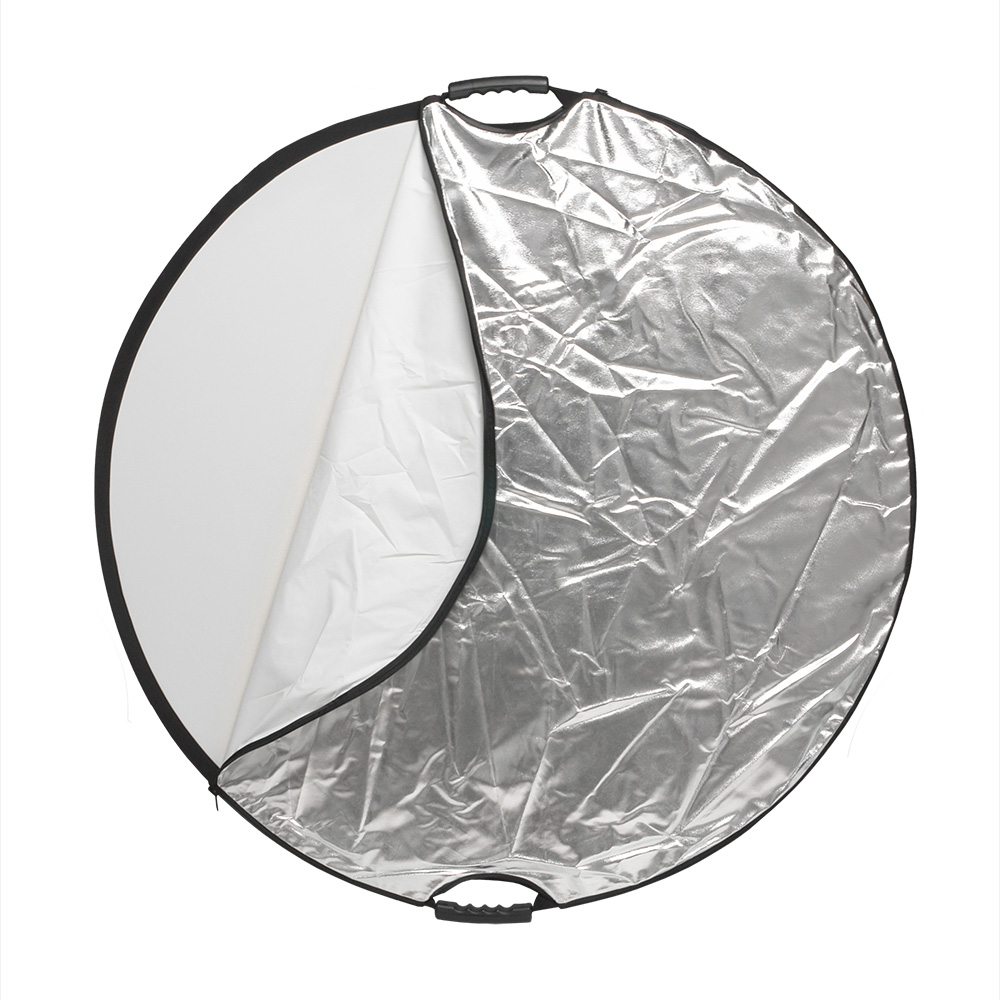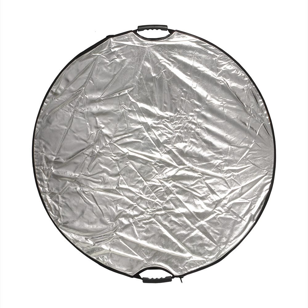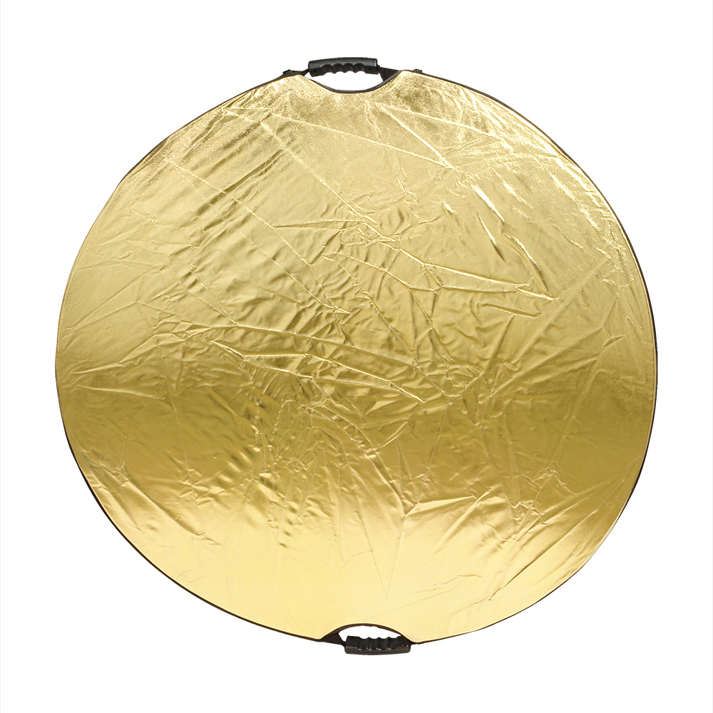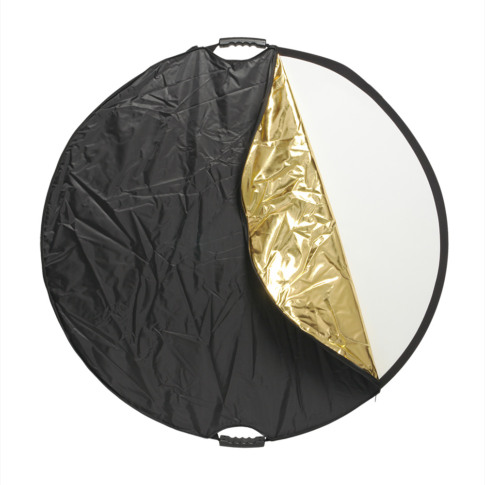 Круглый отражатель 5 в 1: золотистый/серебристый/белый отражающий/ белый просвечивающий/черный. Диаметр 106 см, используется в предметной и портретной съемке, а также для подсветки участков кадра.