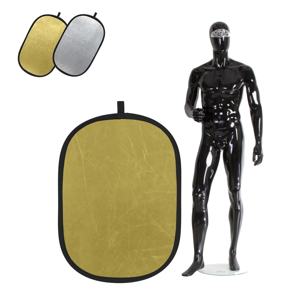 Двусторонний, цвет – золотистый/серебристый. Размер 90х120 см, подходит для поясных портретов и для подсветки отдельных участков кадра.
