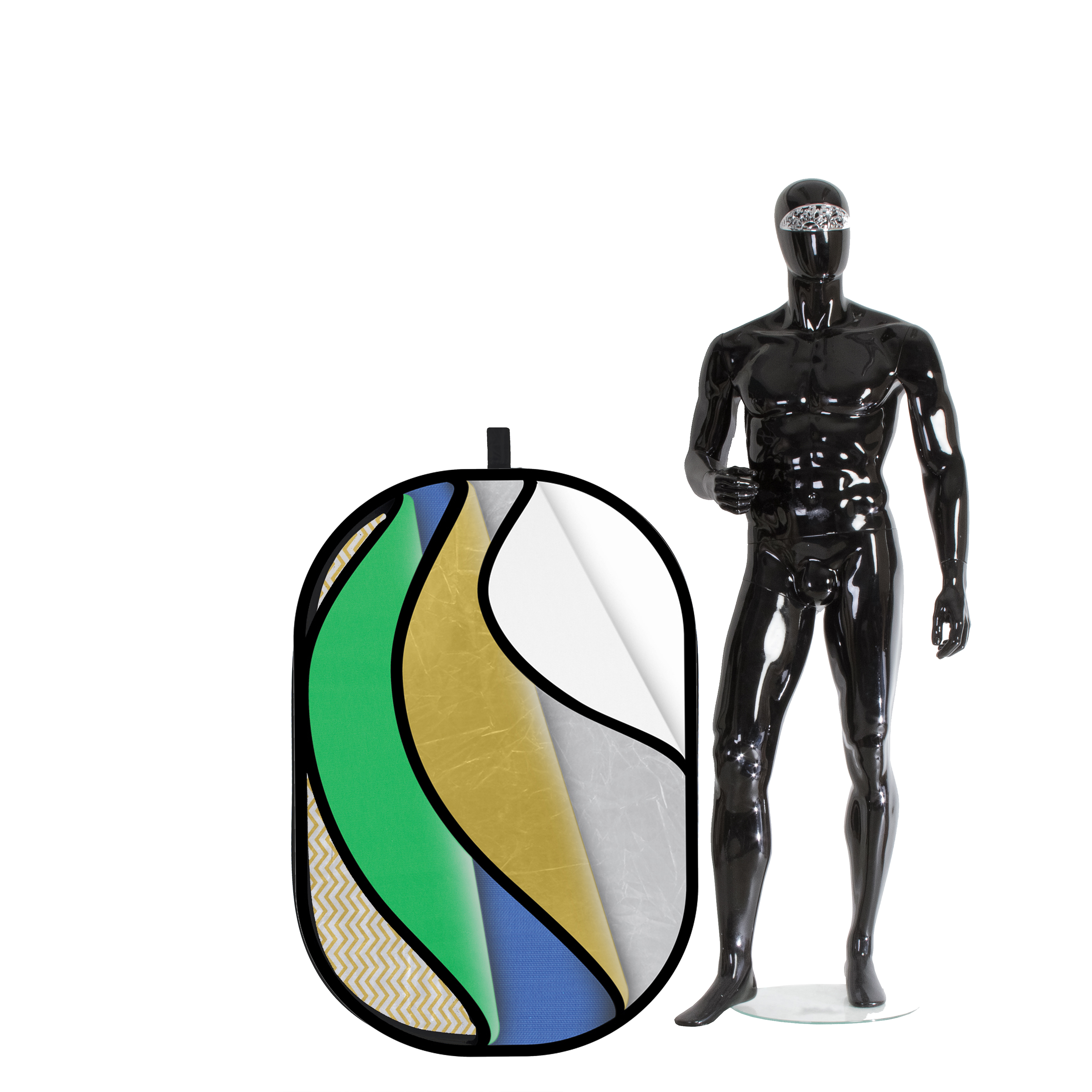 Овальный отражатель 7 в 1: золотистый/серебристый/белый отражающий/ белый просвечивающий/серебристые и золотистые полоски/зеленый/синий. Рабочий размер 70х110 см. Используется в предметной и портретной съемке, а также для подсветки участков кадра.