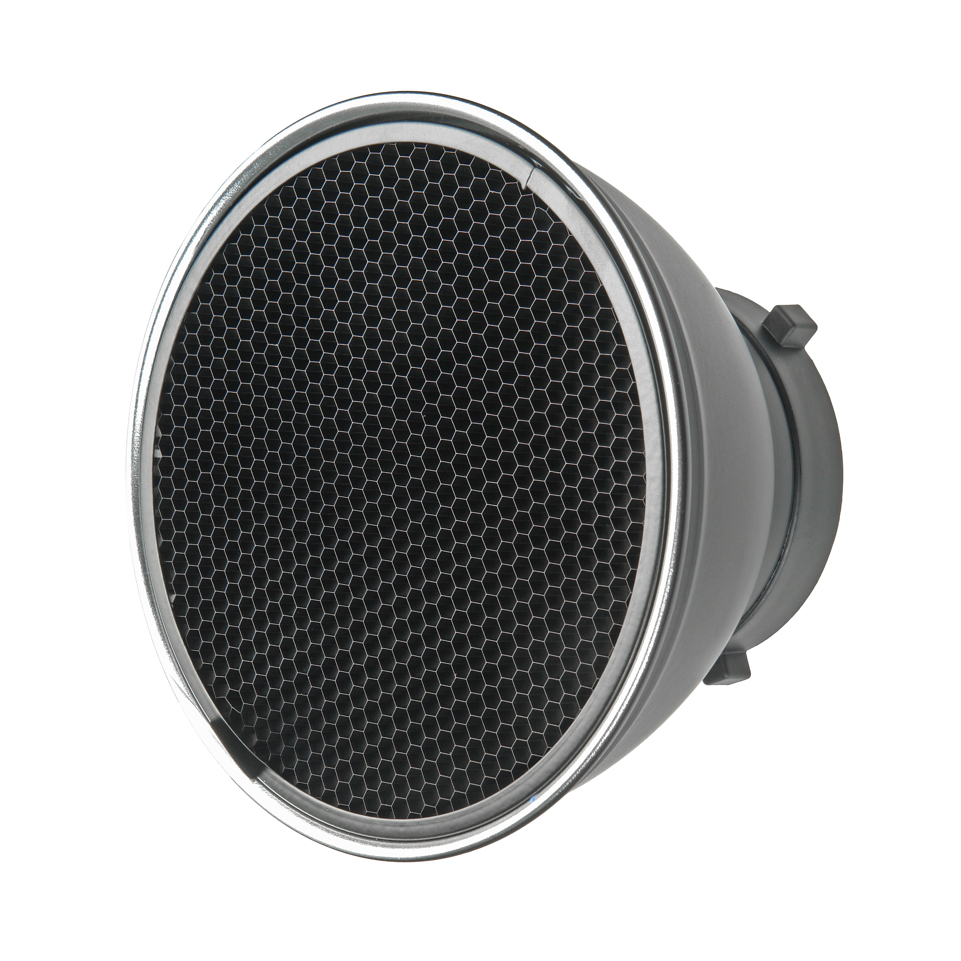 В комплект с рефлектором входят три сотовые насадки с углом рассеяния светового потока 10°, 20°, 30°. Чем меньше угол рассеяния, тем меньше образуемое световое пятно и больше яркость светового потока. Благодаря этому рефлектор способен обеспечить как ограниченное точечное (например, подсветка волос или акцент на предмете), так и широкое фоновое освещение.