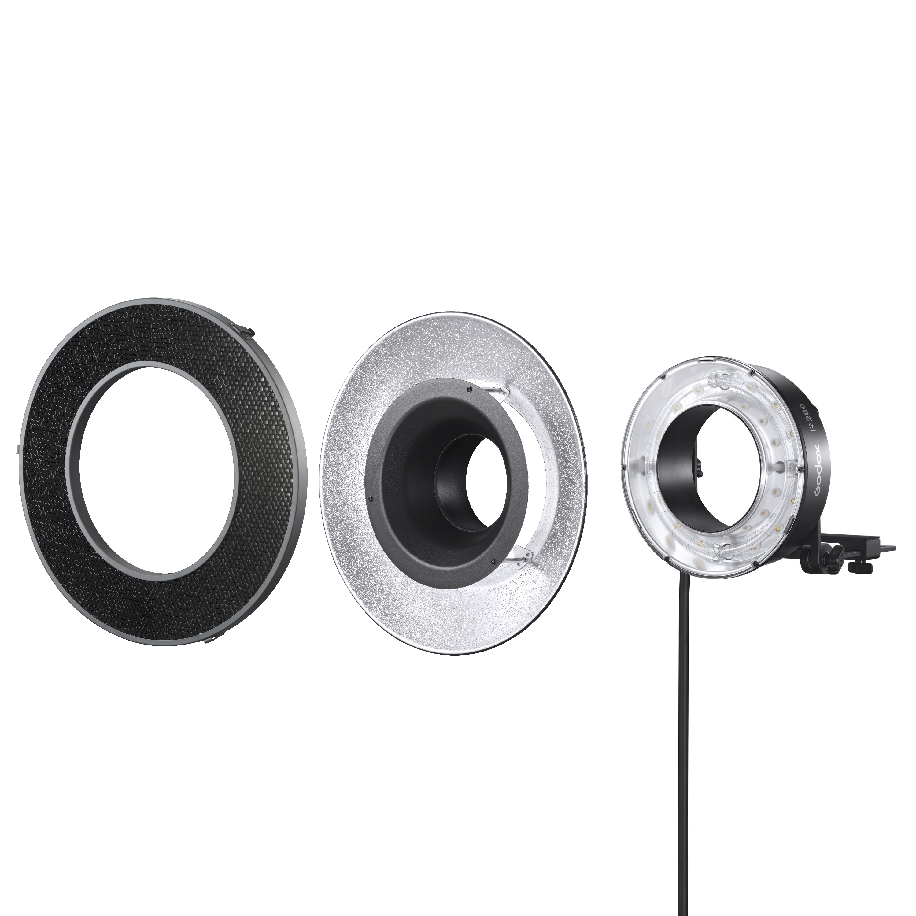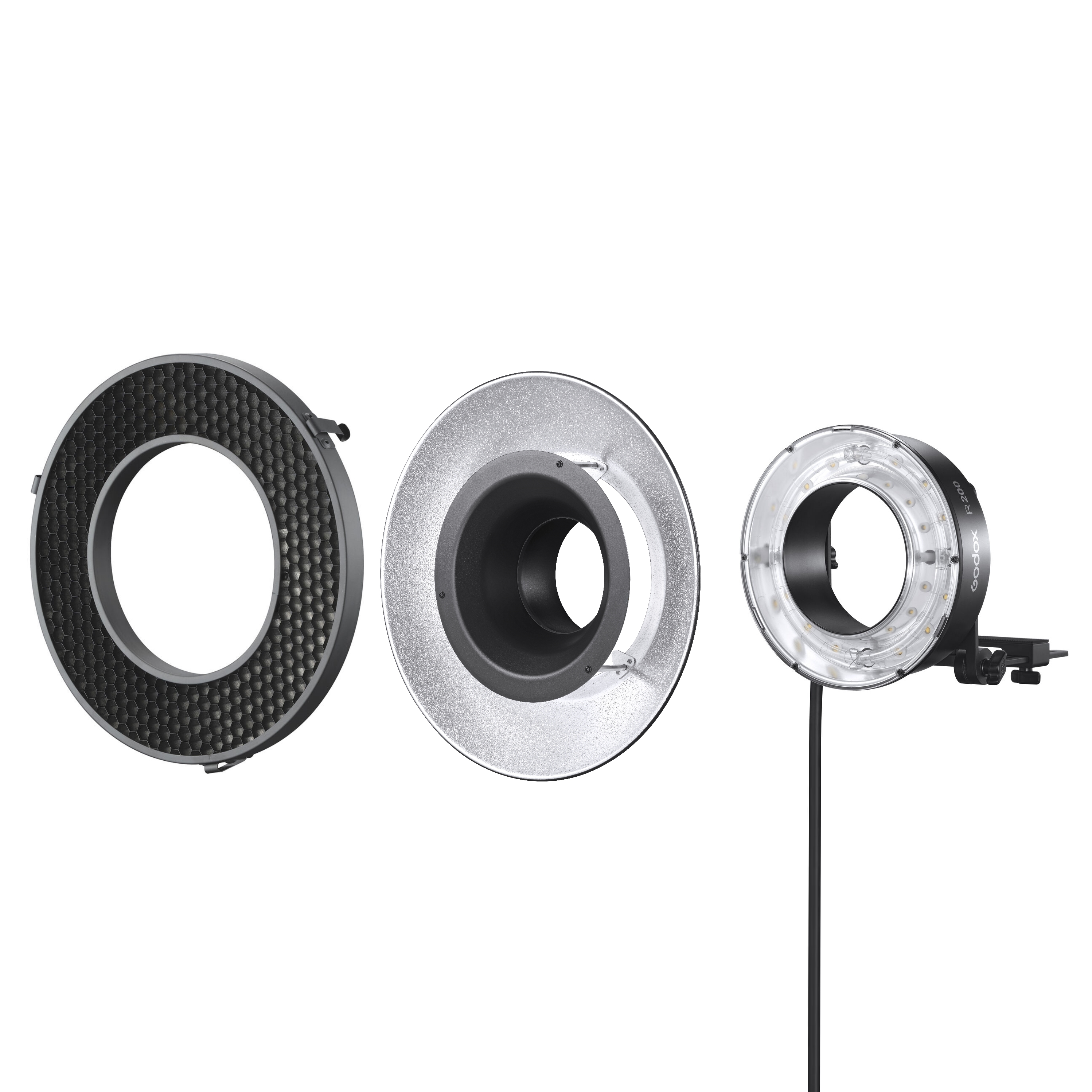 Возможно приобретение дополнительных сотовых насадок Godox R200-RHC20, Godox R200-RHC30, Godox R200-RHC40 с различными углами рассеивания, чтобы сузить и перенаправить световой поток, увеличить яркость внутри светового пятна и уменьшить световые потери по краям.