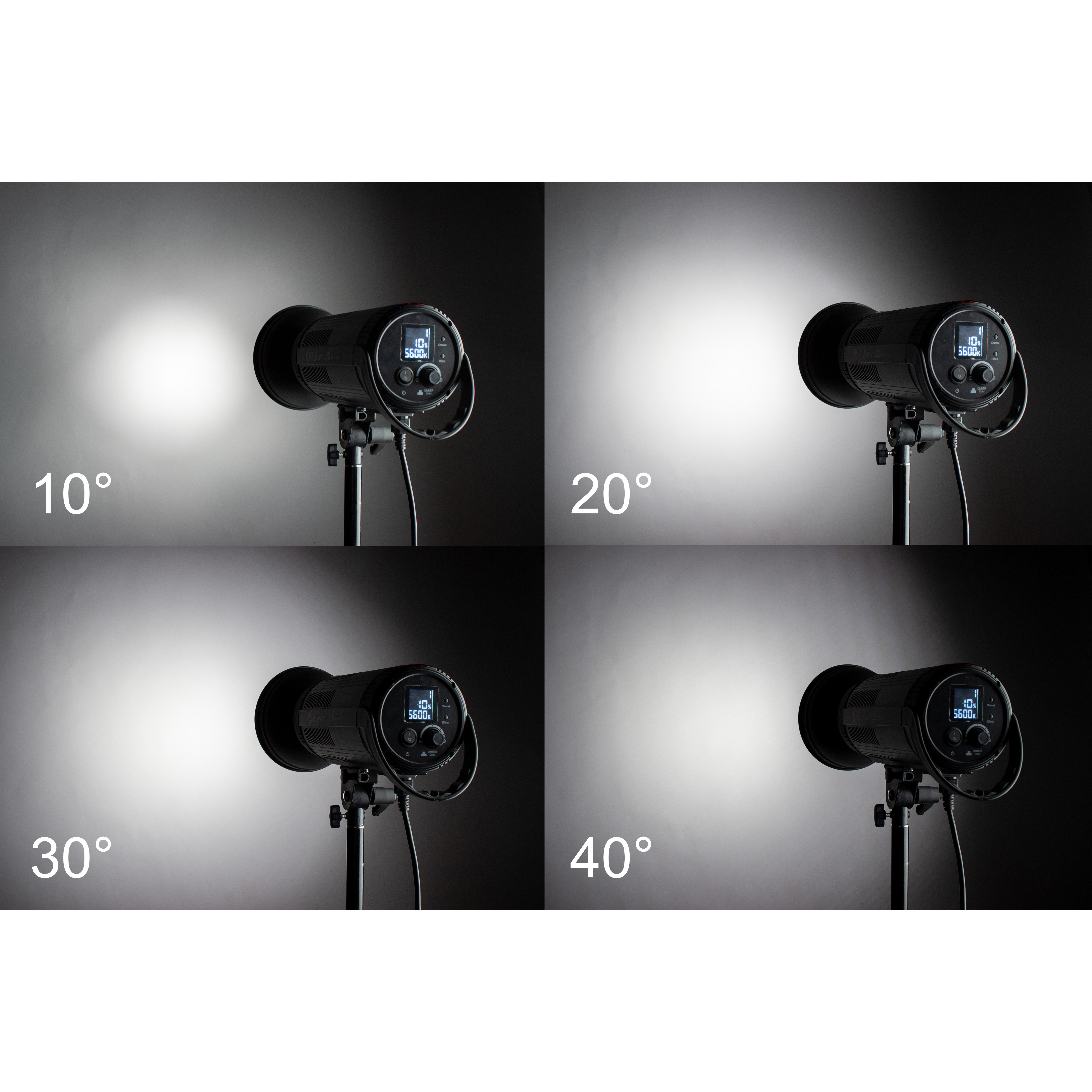 В комплект с рефлектором входят четыре сотовые насадки с углом рассеяния светового потока 10°, 20°, 30°, 40°. Чем меньше угол рассеяния, тем меньше образуемое световое пятно и больше яркость светового потока. Благодаря чему рефлектор способен обеспечить как ограниченное точечное (например, подсветка волос или акцент на предмете), так и широкое фоновое освещение.