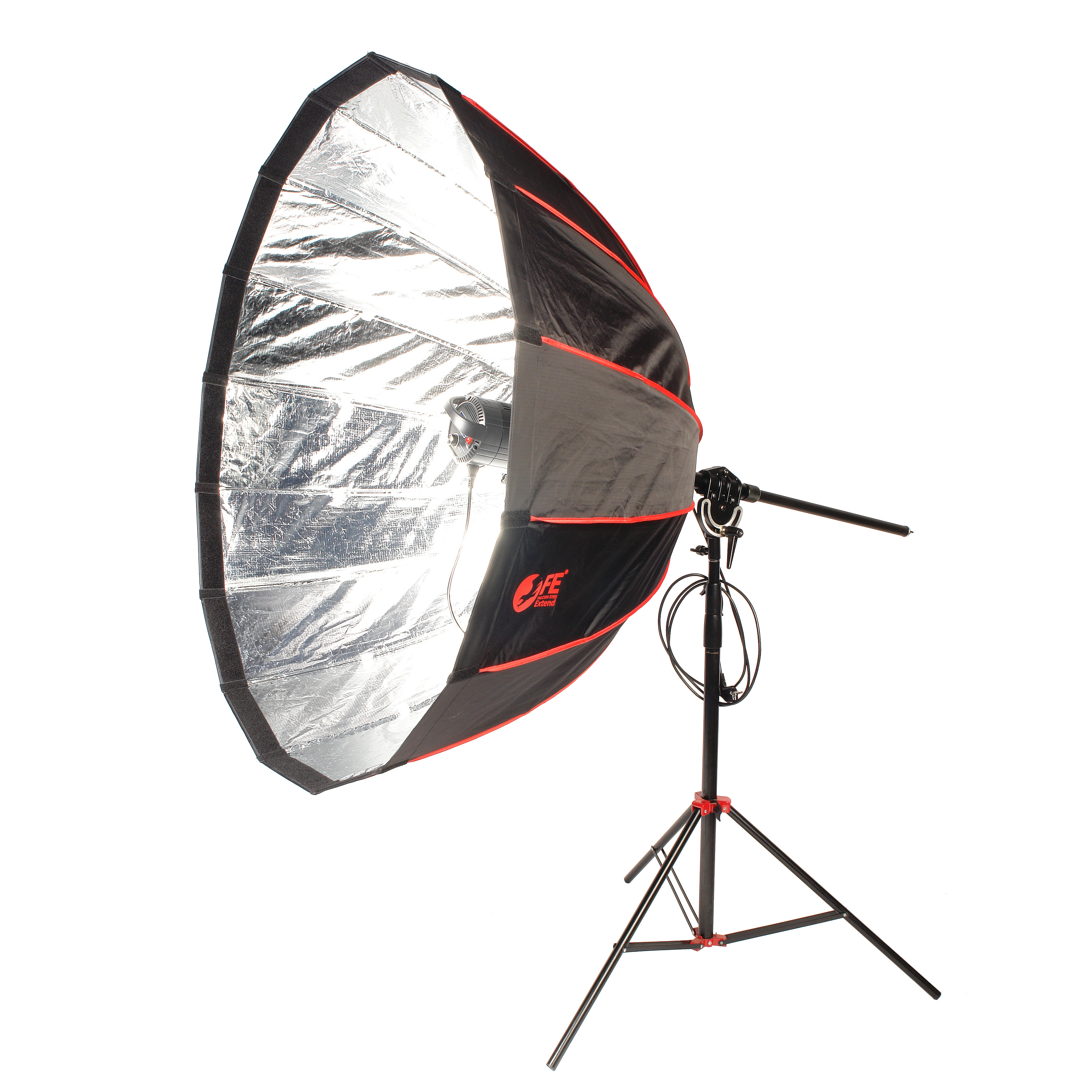 Для достижения наилучшего результата освещения рекомендуем использовать большие глубокие параболические софтбоксы, такие как шестнадцатиугольные Falcon Eyes Extend FEA-OB9 BW или Falcon Eyes Extend FEA-OB12 BW. Софтбокс устанавливается в байонетное кольцо Bowens на конце штанги и проворачивается, фиксируясь прижимным винтом. Установить источник света с другим байонетом можно приобретая дополнительно соответствующие переходные кольца.