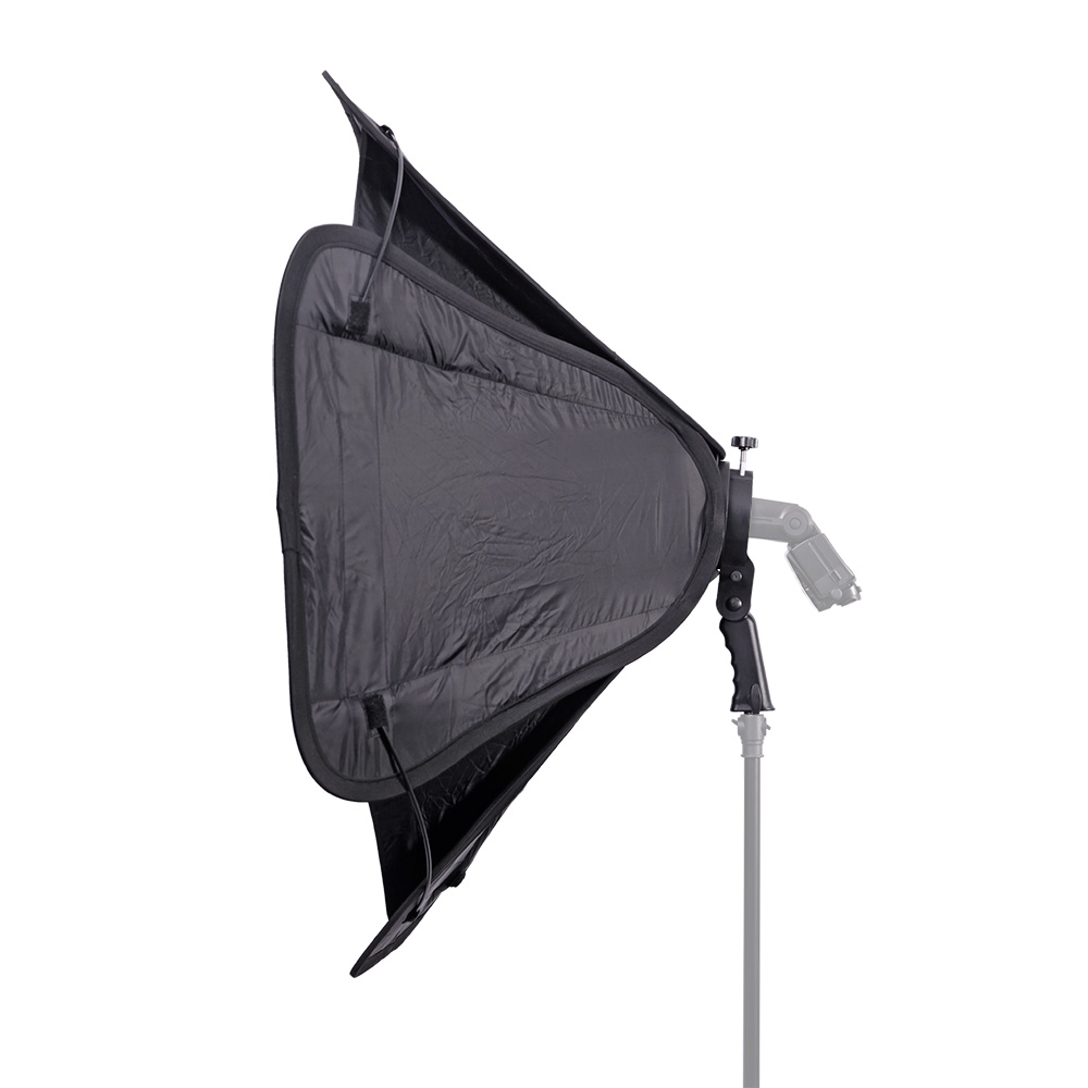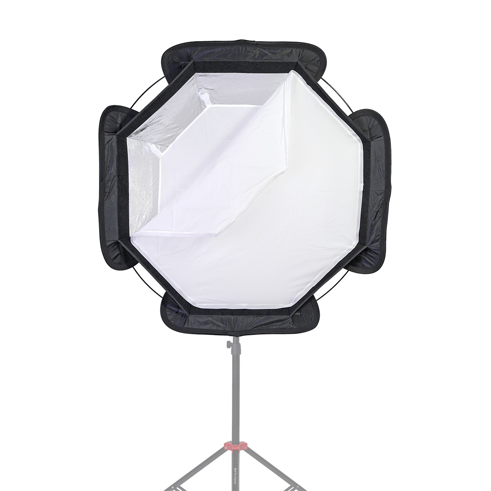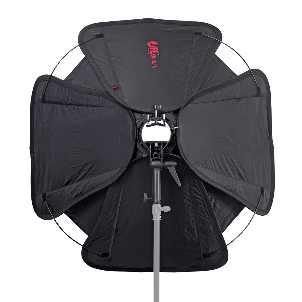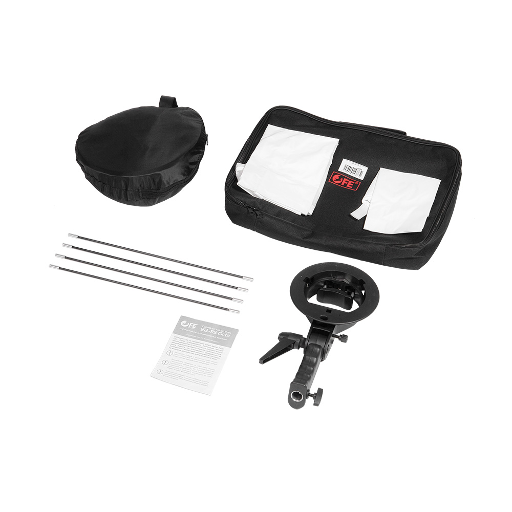 Falcon Eyes EB-95 Octa - быстроскладной софтбокс диаметром 95 см с кронштейном для накамерных вспышек. Фотографы-стробисты по достоинству оценят конструкцию входящего в комплект кронштейна, соответствуя принципу "все-в-одном", кронштейн является универсальным крепежным устройством, совместим с любой накамерной вспышкой и позволяет устанавливать насадки Bowens. Крепление Bowens обеспечивает совместимость с большим разнообразием светомодифицирующих аксессуаров, например: рефлекторы, портретные тарелки, софтбоксы, конусы и т. д. На кронштейне находится отверстие для установки зонтика и удобная рукоятка для регулировки направления освещения. Быстрый и надежный монтаж вспышки, не требуется использование липучек Велкро, нет нагрузки на "горячий башмак", резиновые вставки на зажиме препятствуют появлению царапин на корпусе вспышки.