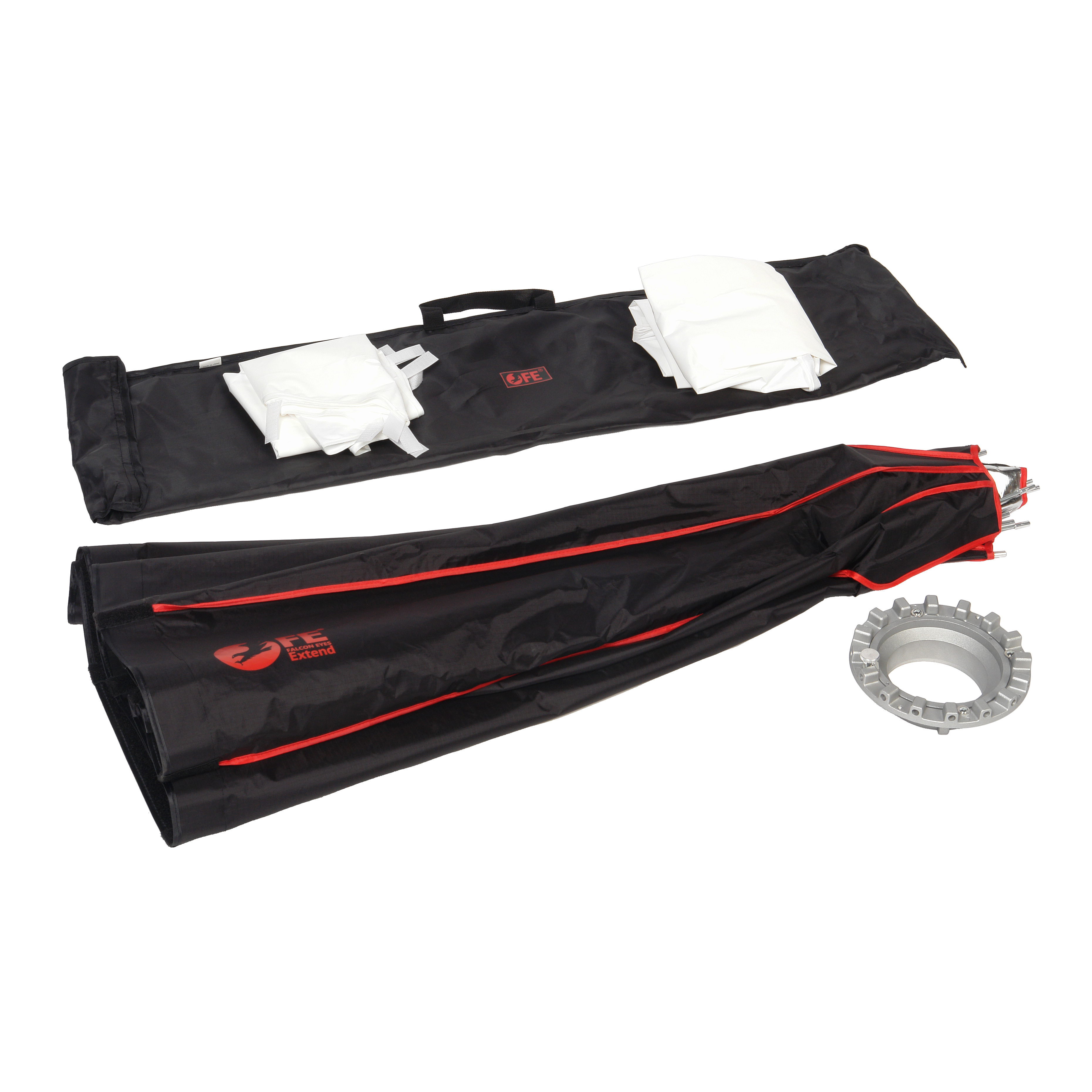 Устройство состоит из несущего каркаса (литой алюминиевый адаптер и сменное байонетное кольцо на Bowens), серебристого тканевого отражателя, внешнего и внутреннего рассеивателя. Для установки Extend FEA-OB12 BW на осветительные приборы с другим байонетом можно использовать переходные кольца (приобретаются отдельно, диаметр 134 мм).