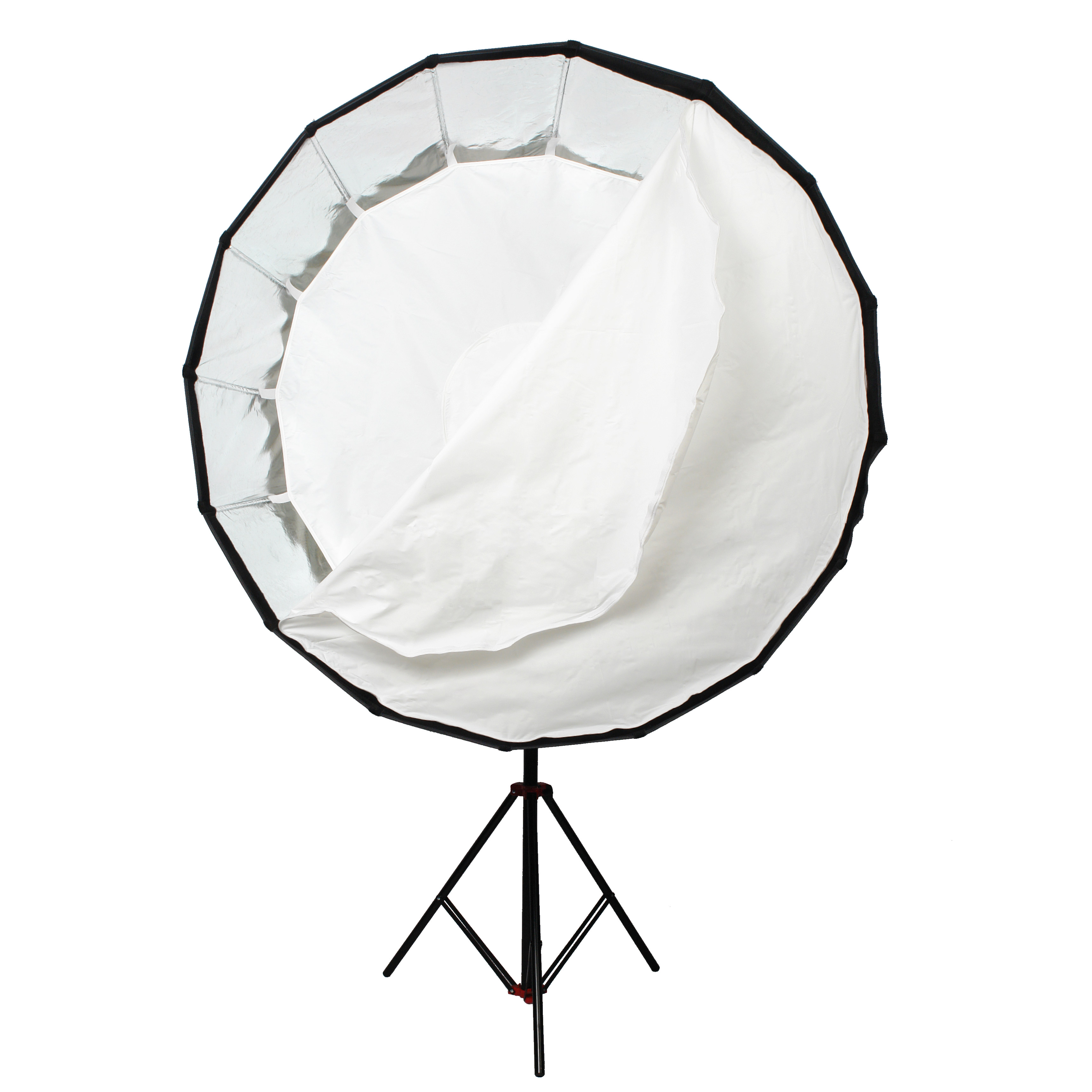 Закрытая конструкция позволяет избежать нежелательных бликов и потерь светового потока. Отражатель, с серебристой тканью внутри, обеспечивает равномерную засветку рассеивателя, который в свою очередь, благодаря большой поверхности, смягчает формируемые тени. Дополнительный внутренний диффузор улучшает равномерность светового потока. Наконечники на упругих металлических спицах не повреждают тканевые спицедержатели софтбокса и облегчают сборку конструкции.