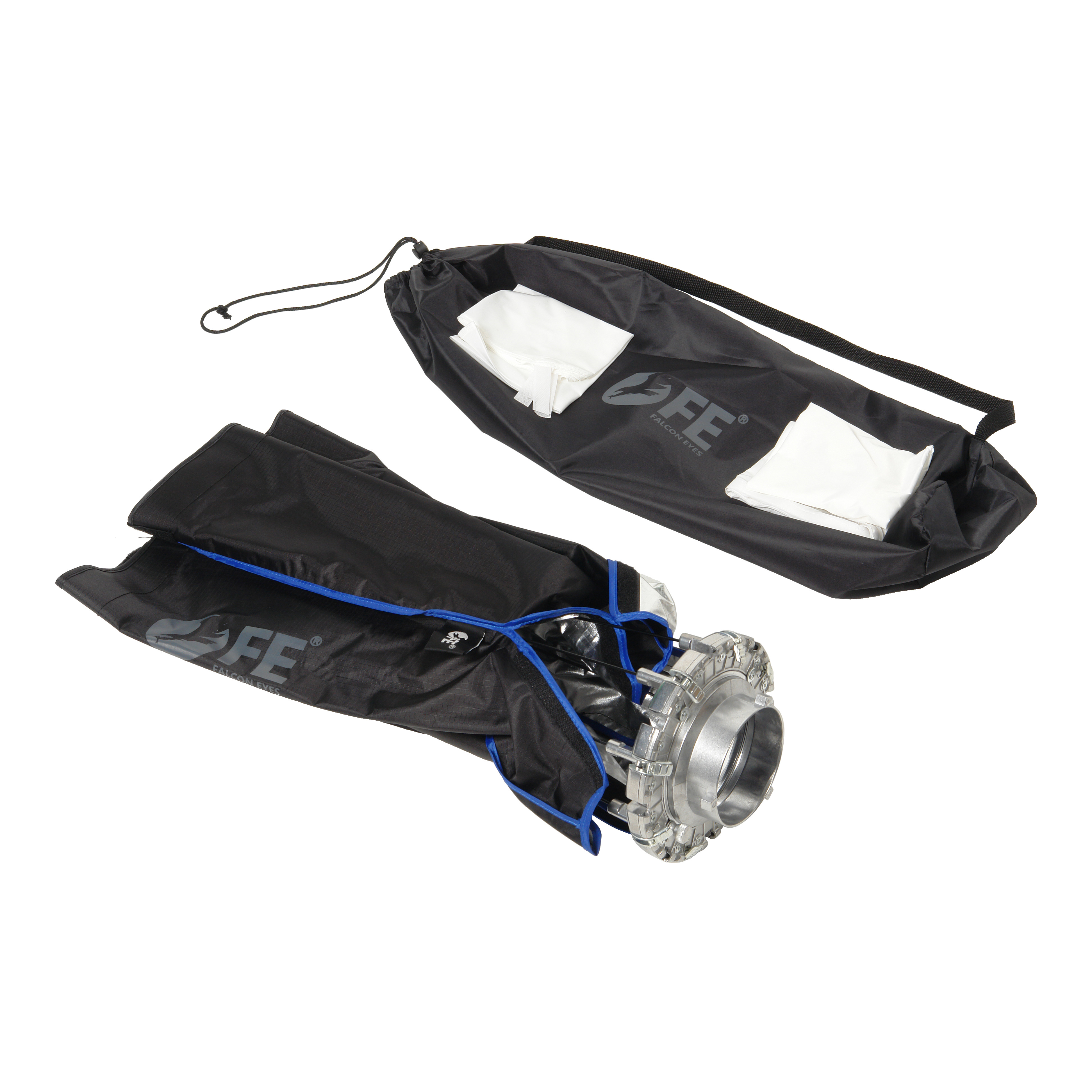 В комплект софтбокса входят тканевые рассеиватели — внутренний и внешний диффузоры. Диффузоры сделаны из полистирола стабилизированного типа. При минимуме поглощения проходящего света, они позволяют получить на выходе хорошее, ровное световое пятно. Внутренний диффузор крепится к лентам на спицах, а внешний — по периметру купола софтбокса на широкую 5 см ленту по краю или «вглубь» софтбокса. При установке внешнего диффузора с заглублением, остается возможность установить соты (приобретаются отдельно).