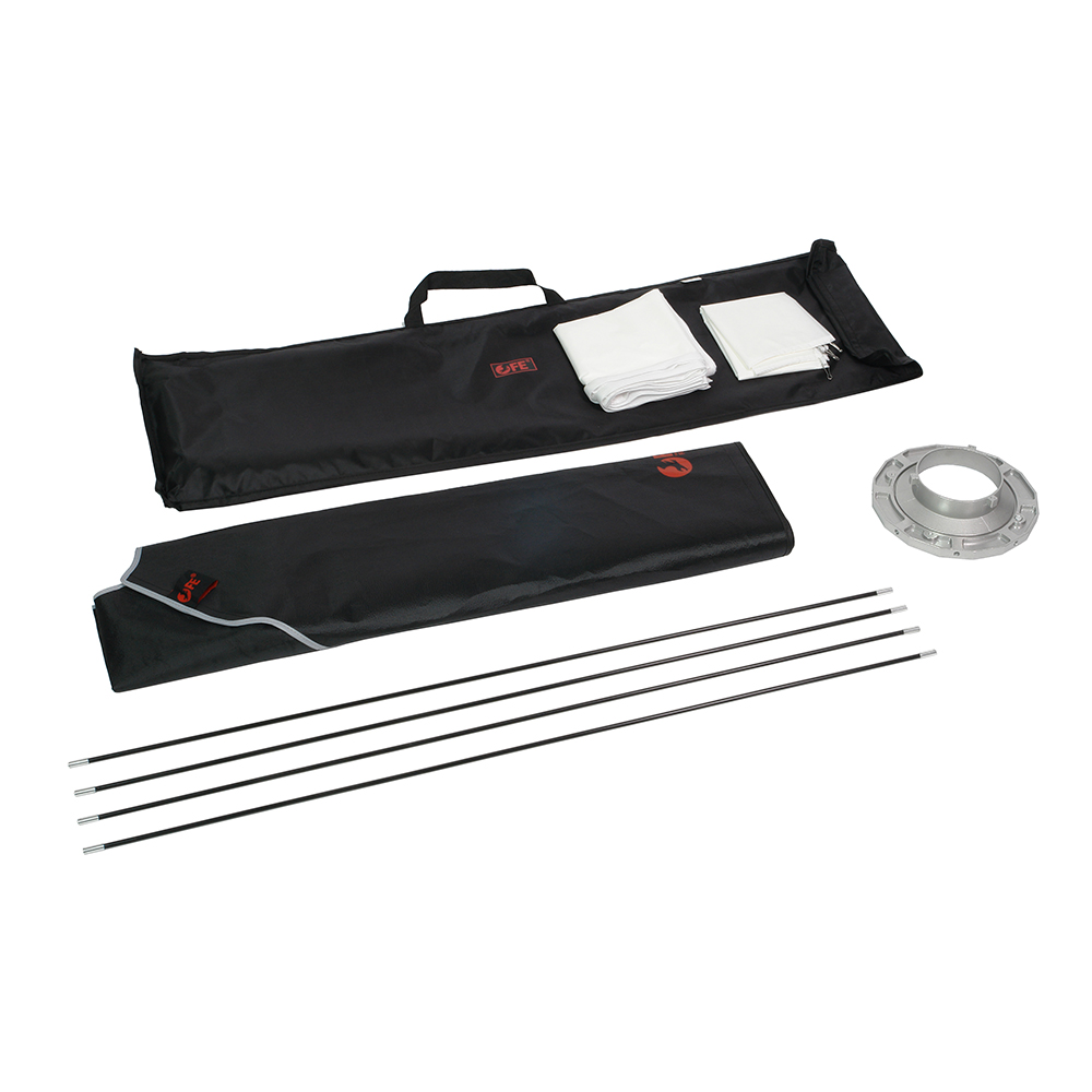 Устройство состоит из отражателя, внешнего и внутреннего рассеивателя, несущего каркаса (литой алюминиевый адаптер и сменное байонетное кольцо на Bowens). Для установки FEA-SB 120120 BW на осветительные приборы с другим байонетом можно использовать переходные кольца(приобретаются отдельно, диаметр 145 мм).