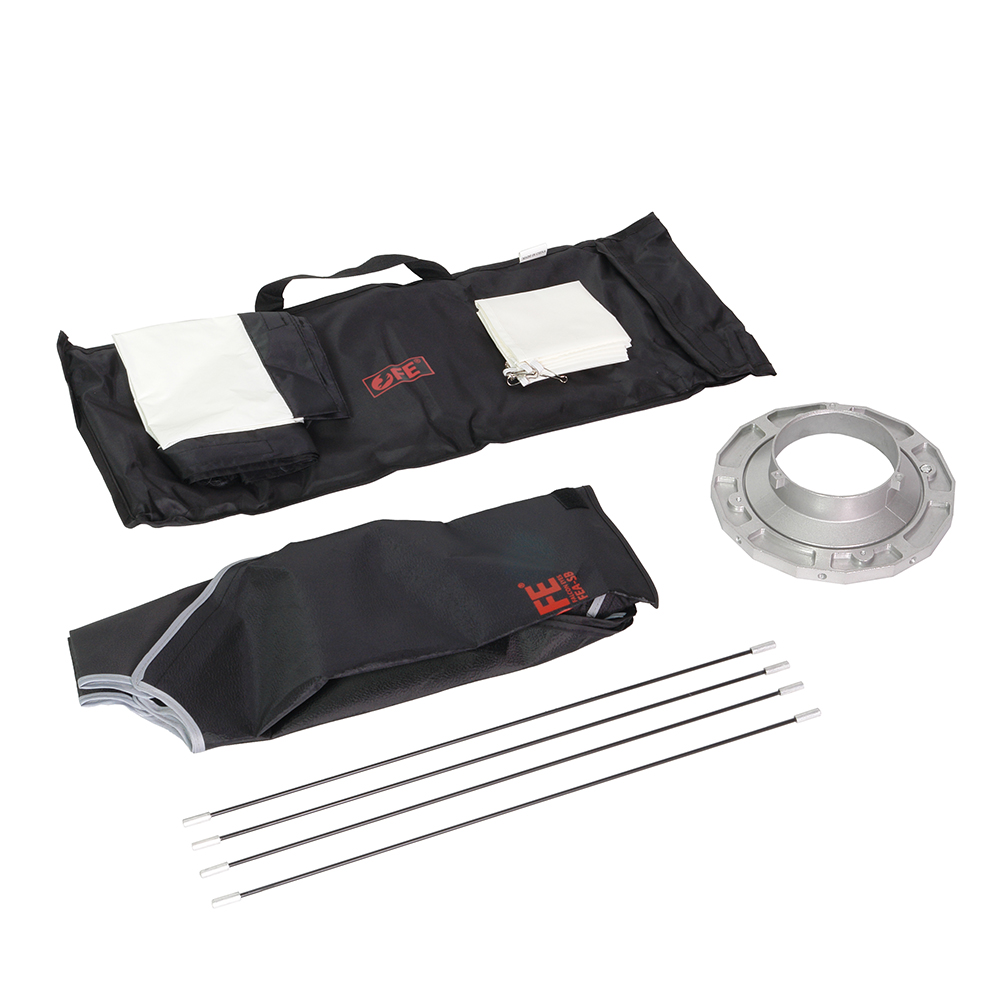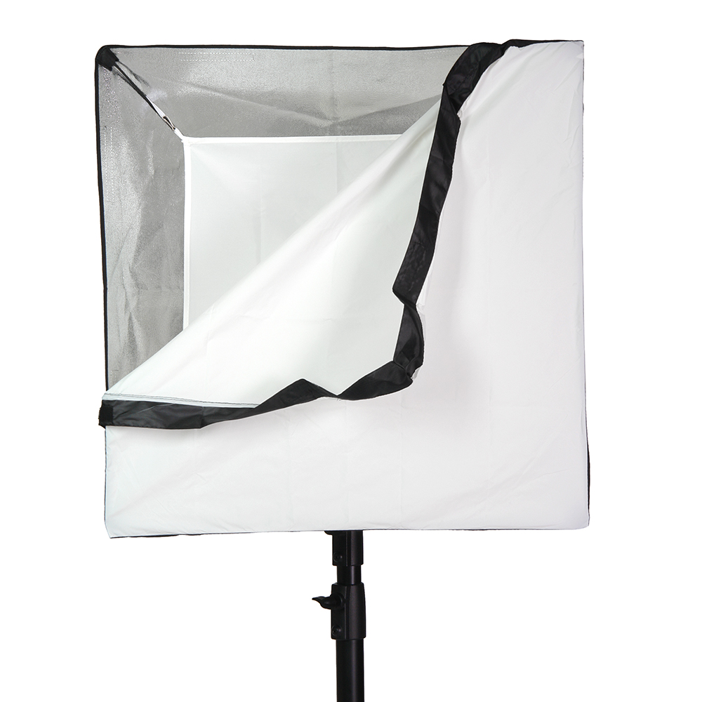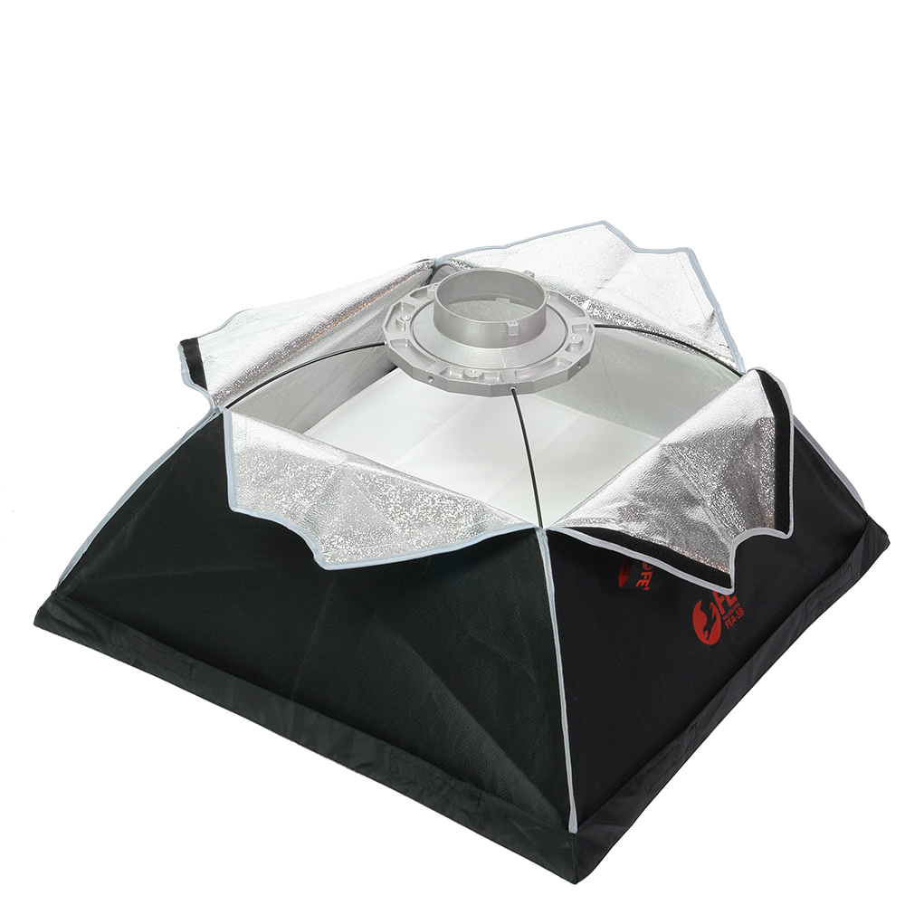 Закрытая конструкция позволяет избежать нежелательных бликов и потерь светового потока. Отражатель, с серебристой тканью внутри, обеспечивает равномерную засветку рассеивателя, который в свою очередь, благодаря большой поверхности, смягчает формируемые тени. Дополнительный внутренний диффузор улучшает равномерность светового потока. Наконечники на упругих металлических спицах не повреждают тканевые спицедержатели софтбокса и облегчают сборку конструкции.