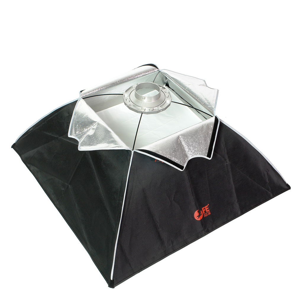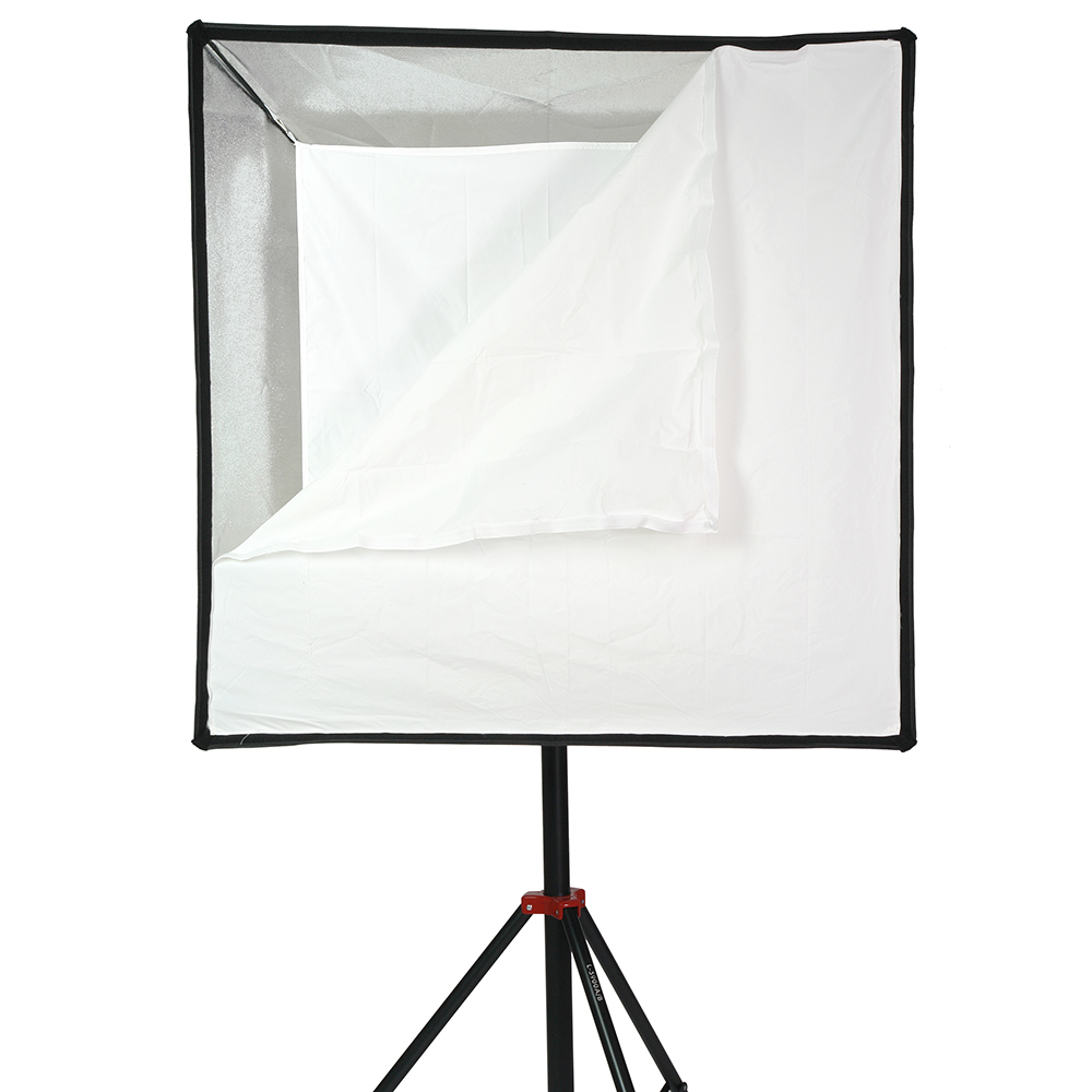 Закрытая конструкция позволяет избежать нежелательных бликов и потерь светового потока. Отражатель, с серебристой тканью внутри, обеспечивает равномерную засветку рассеивателя, который в свою очередь, благодаря большой поверхности, смягчает формируемые тени. Дополнительный внутренний диффузор улучшает равномерность светового потока. Наконечники на упругих металлических спицах не повреждают тканевые спицедержатели софтбокса и облегчают сборку конструкции.