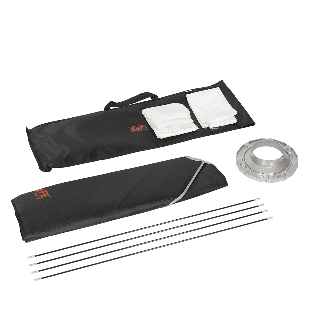 Устройство состоит из отражателя, внешнего и внутреннего рассеивателя, несущего каркаса (литой алюминиевый адаптер и сменное байонетное кольцо на Bowens). Для установки FEA-SB 9090 BW на осветительные приборы с другим байонетом можно использовать переходные кольца (приобретаются отдельно, диаметр 145 мм).