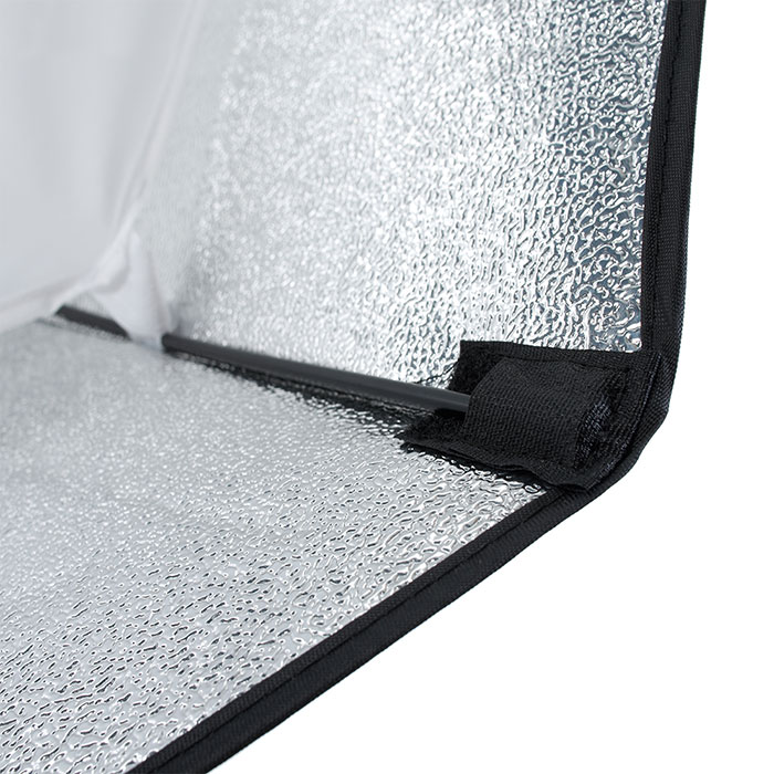 Закрытая конструкция позволяет избежать нежелательных бликов и потерь светового потока. Отражатель обеспечивает равномерную засветку рассеивателя, который в свою очередь, благодаря большой поверхности, смягчает формируемые тени. Дополнительный внутренний диффузор улучшает равномерность светового потока. Наконечники на упругих металлических спицах не повреждают тканевые спицедержатели софтбокса и облегчают сборку конструкции.