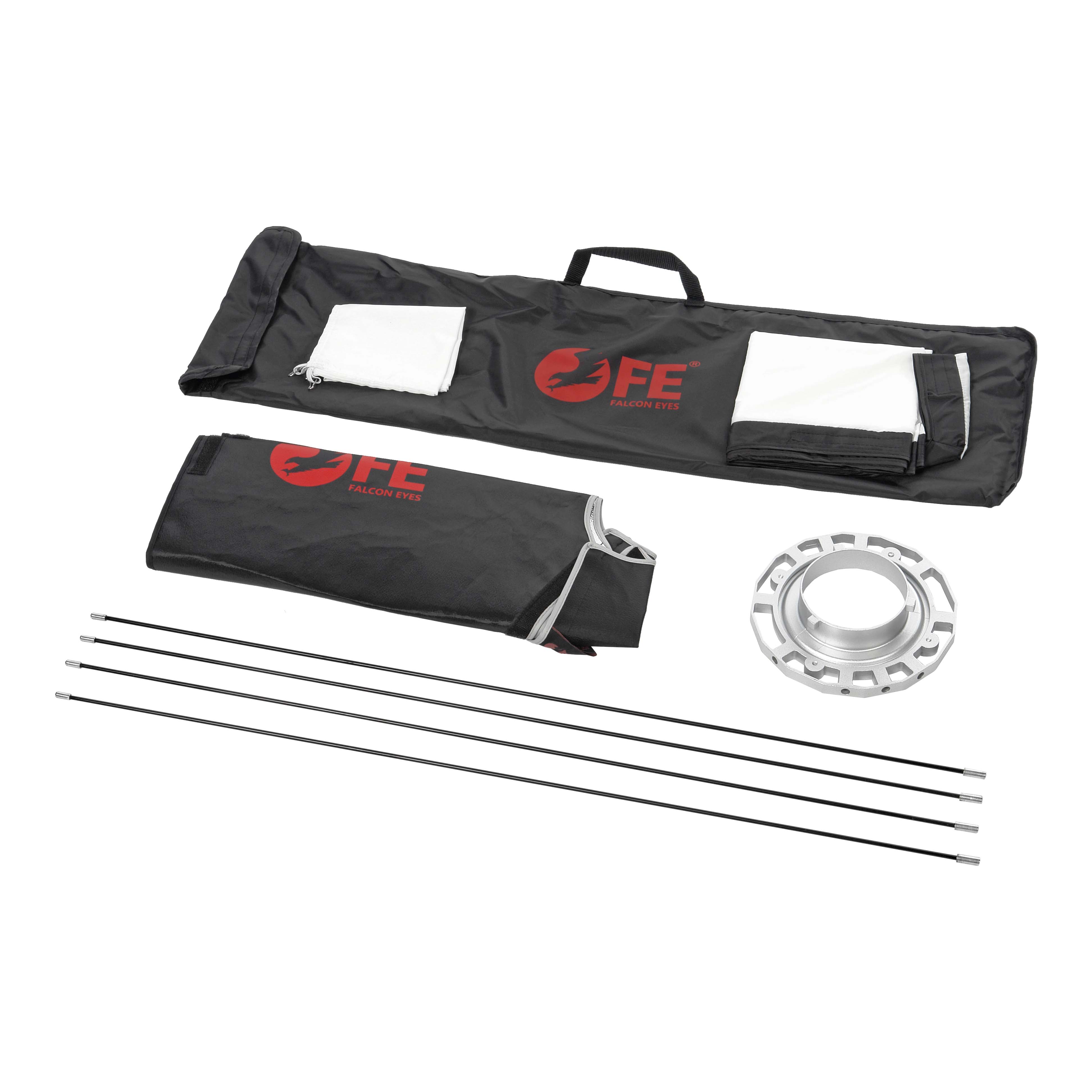 Световой модификатор состоит из тента-отражателя, внешнего и внутреннего тканевых рассеивателей (диффузоров), байонетного кольца (крепления) и четырех стальных спиц. В комплект также входит чехол для хранения и транспортировки софтбокса.