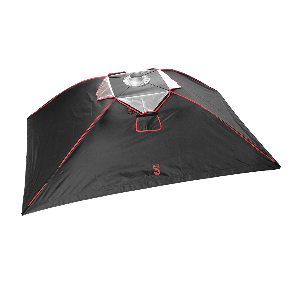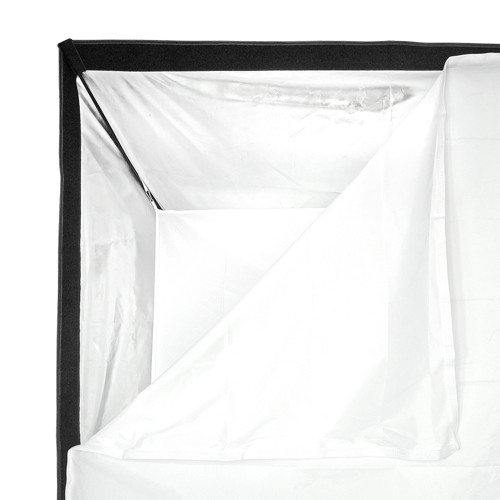 Закрытая конструкция позволяет избежать нежелательных бликов и потерь светового потока. Отражатель, с серебристой тканью внутри, обеспечивает равномерную засветку рассеивателя, который в свою очередь, благодаря большой поверхности, смягчает формируемые тени. Дополнительный внутренний диффузор улучшает равномерность светового потока. Наконечники на упругих металлических спицах не повреждают тканевые спицедержатели софтбокса и облегчают сборку конструкции.