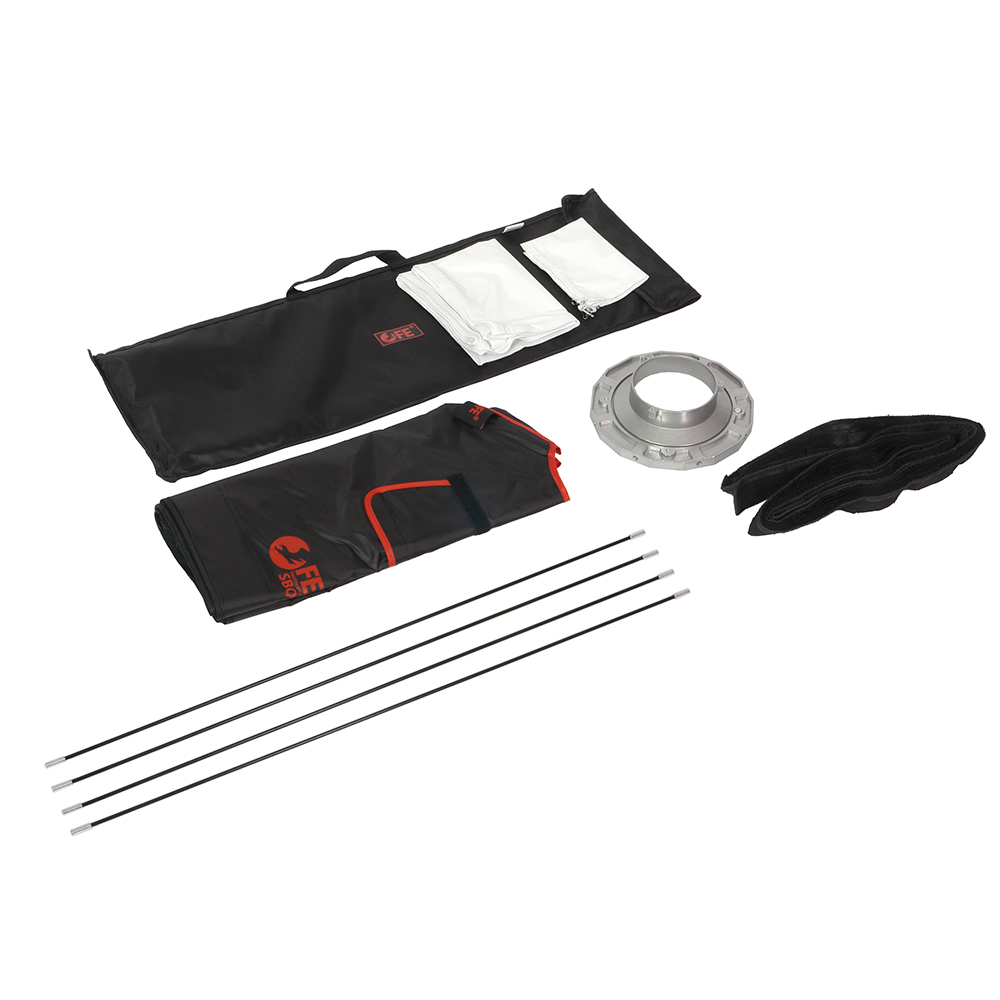 Несущий каркас включает в себя литой алюминиевый адаптер, стальные спицы с наконечниками и сменное байонетное кольцо на Bowens. Для установки
