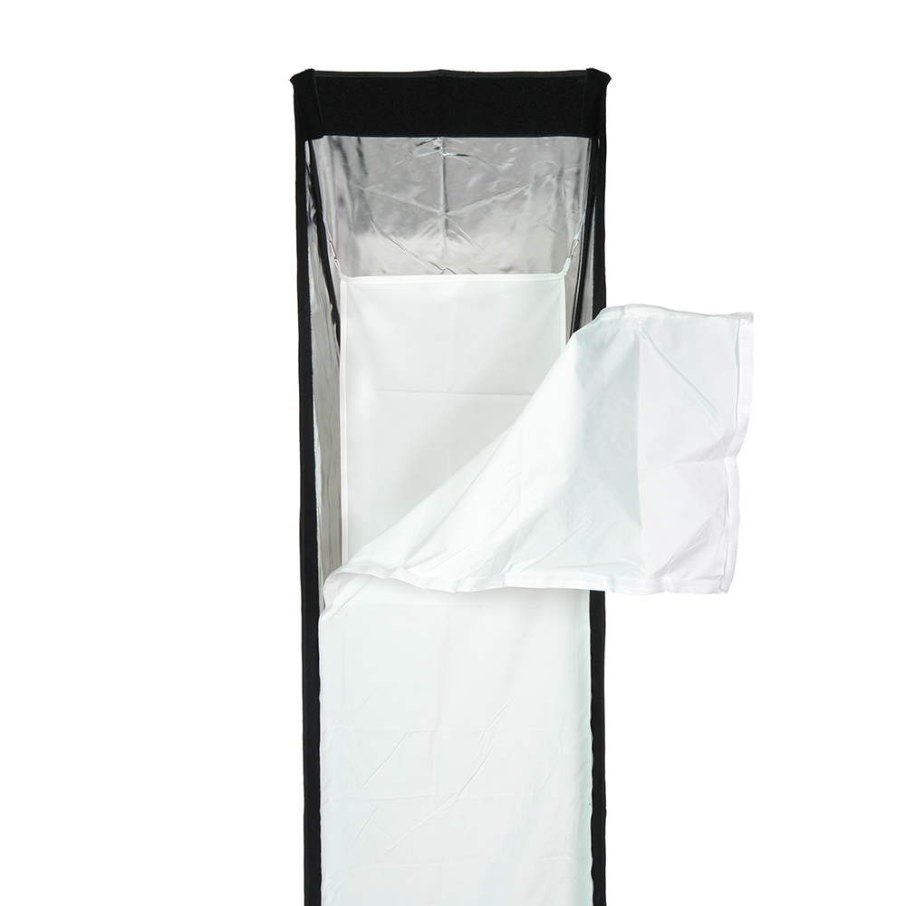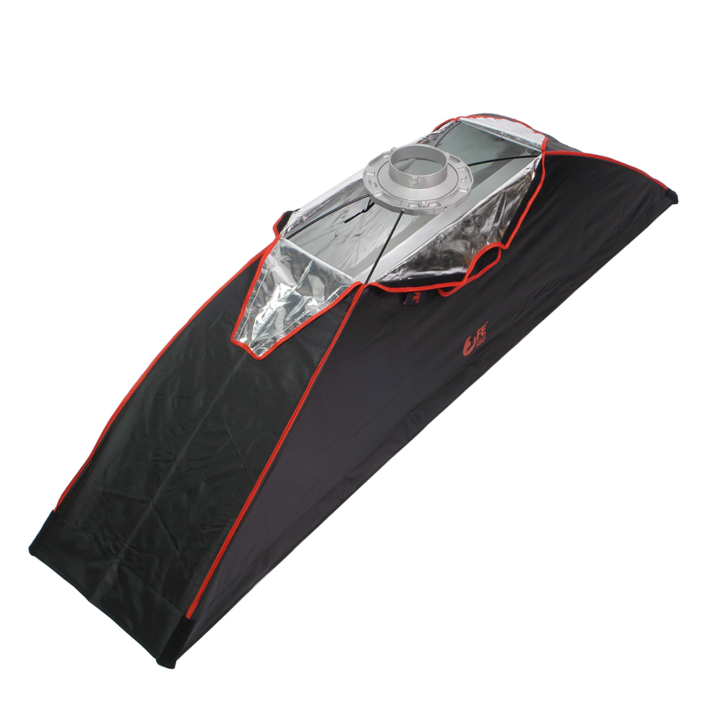 Закрытая конструкция позволяет избежать нежелательных бликов и потерь светового потока. Отражатель, с серебристой тканью внутри, обеспечивает равномерную засветку рассеивателя, который в свою очередь, благодаря большой поверхности, смягчает формируемые тени. Дополнительный внутренний диффузор улучшает равномерность светового потока. Наконечники на упругих металлических спицах не повреждают тканевые спицедержатели софтбокса и облегчают сборку конструкции.
