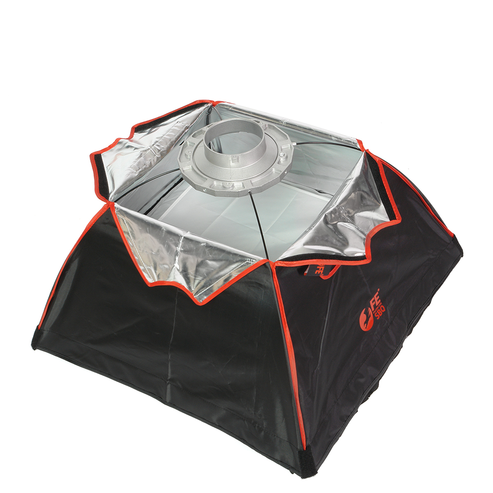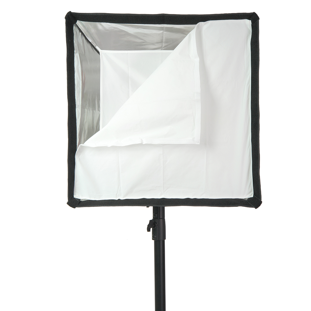 Закрытая конструкция позволяет избежать нежелательных бликов и потерь светового потока. Отражатель, с серебристой тканью внутри, обеспечивает равномерную засветку рассеивателя, который в свою очередь, благодаря большой поверхности, смягчает формируемые тени. Дополнительный внутренний диффузор улучшает равномерность светового потока. Наконечники на упругих металлических спицах не повреждают тканевые спицедержатели софтбокса и облегчают сборку конструкции.