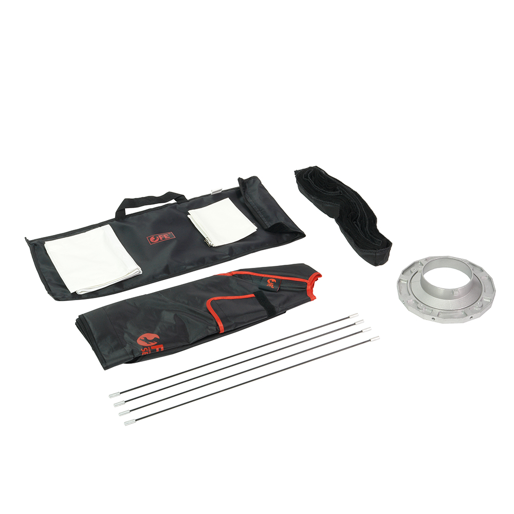 Несущий каркас включает в себя литой алюминиевый адаптер, стальные спицы с наконечниками и сменное байонетное кольцо на Bowens. Для установки