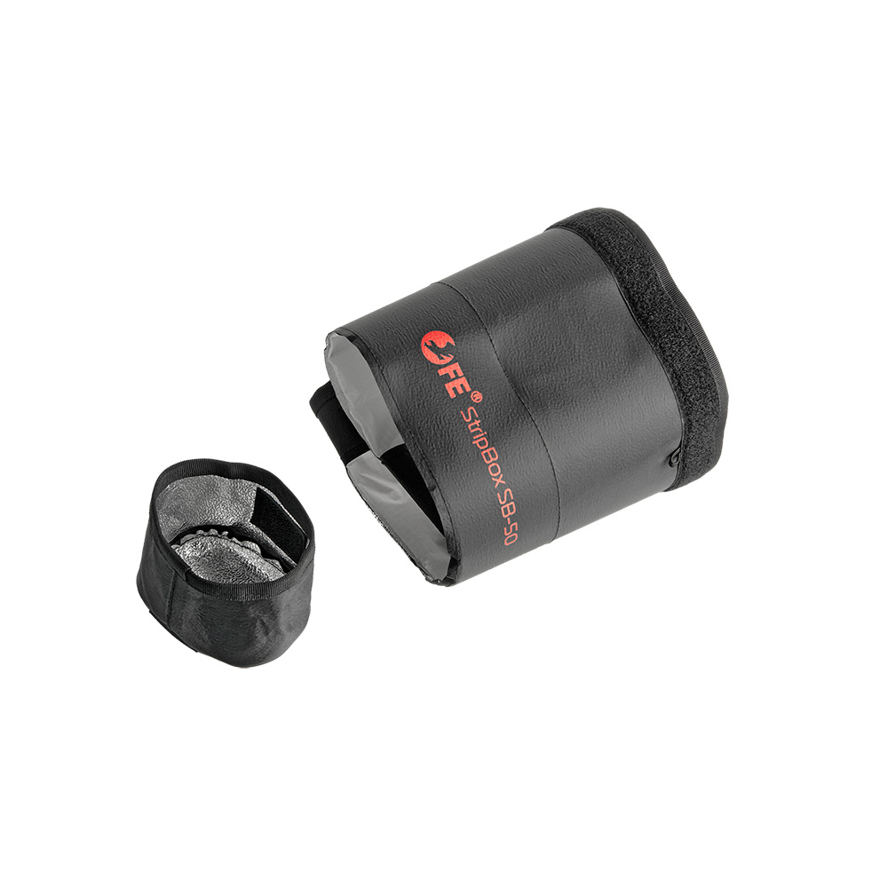Накамерная вспышка просто вставляется в софтбокс Falcon Eyes StripBox SB-50. Софтбокс крепится к излучающей голове накамерной вспышки. Удерживается — за счёт плотного оборачивания вокруг головы, фиксируется липучкой.