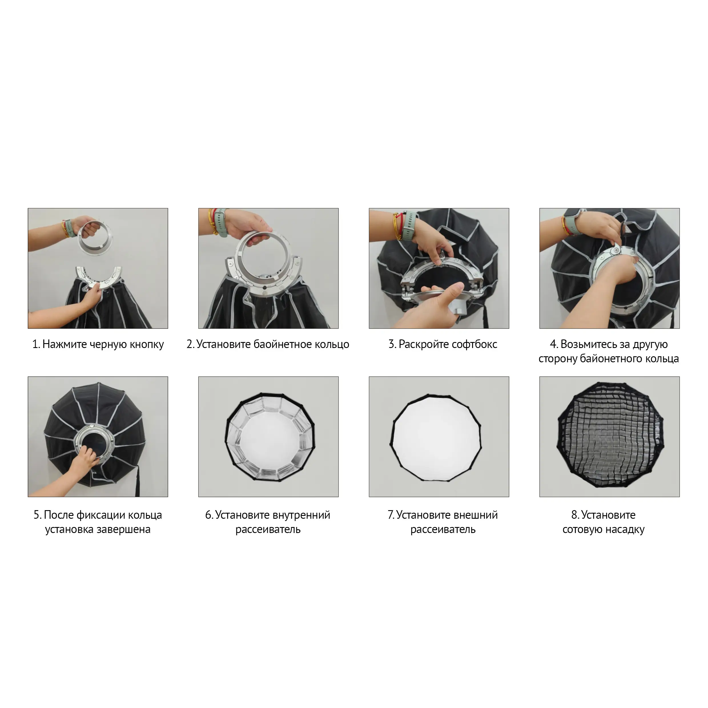 Глубокая параболическая 12-гранная конструкция формирует направленный, но мягкий пучок света. Двойной рассеиватель (внутренний + внешний) устраняет горячие точки и обеспечивает равномерность освещения по всей поверхности даже при близком расположении источника. Тканевая сотовая решетка сужает световой конус, минимизирует засветку фона и позволяет выделять объект без дополнительных флагов.