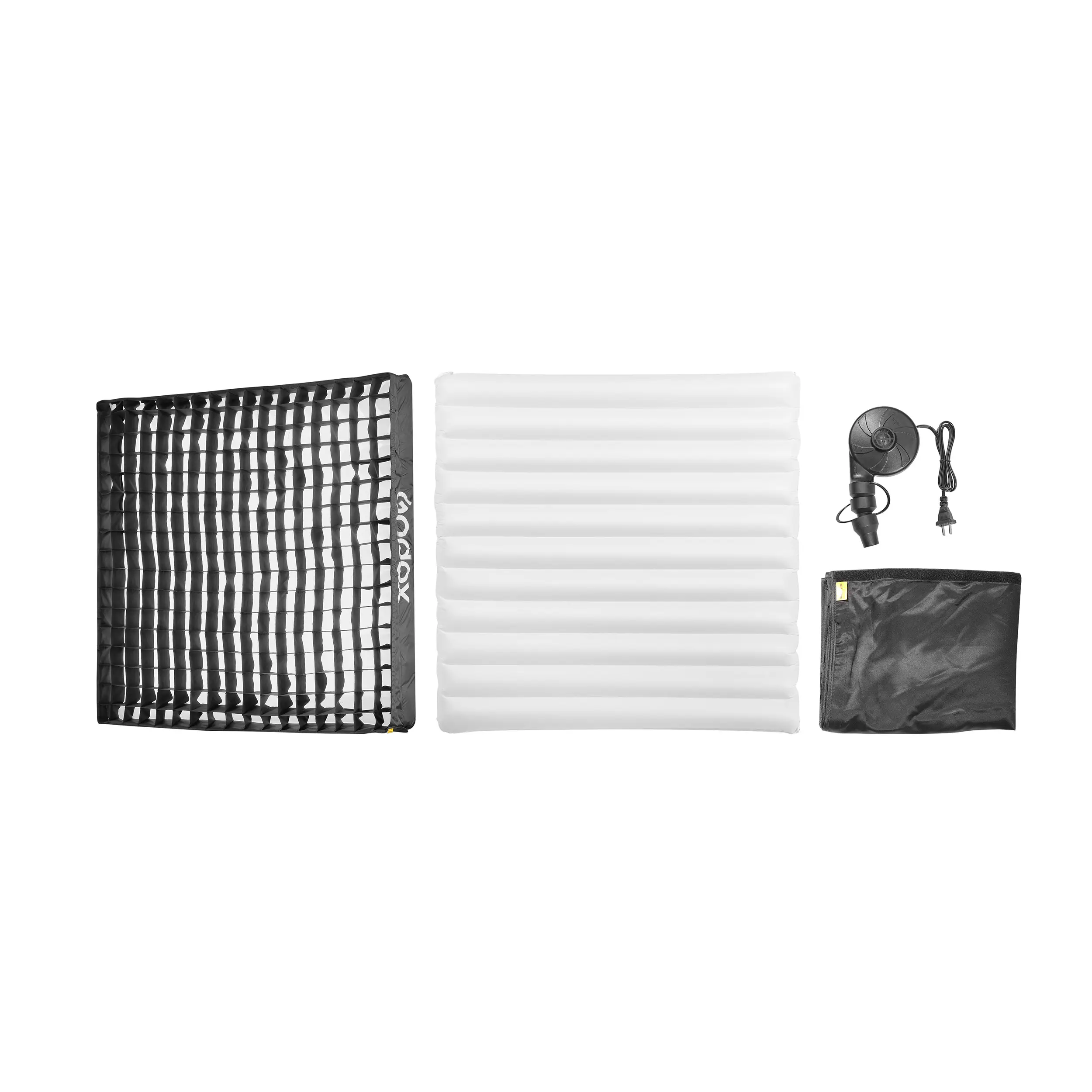 В сдутом виде FA800 компактно складывается и занимает совсем немного места. Вместе с аксессуарами и насосом он весит всего 3,5 кг. К софтбоксу прилагается сумка для хранения и перевозки размером 80х48 см, в которую помещается весь комплект.