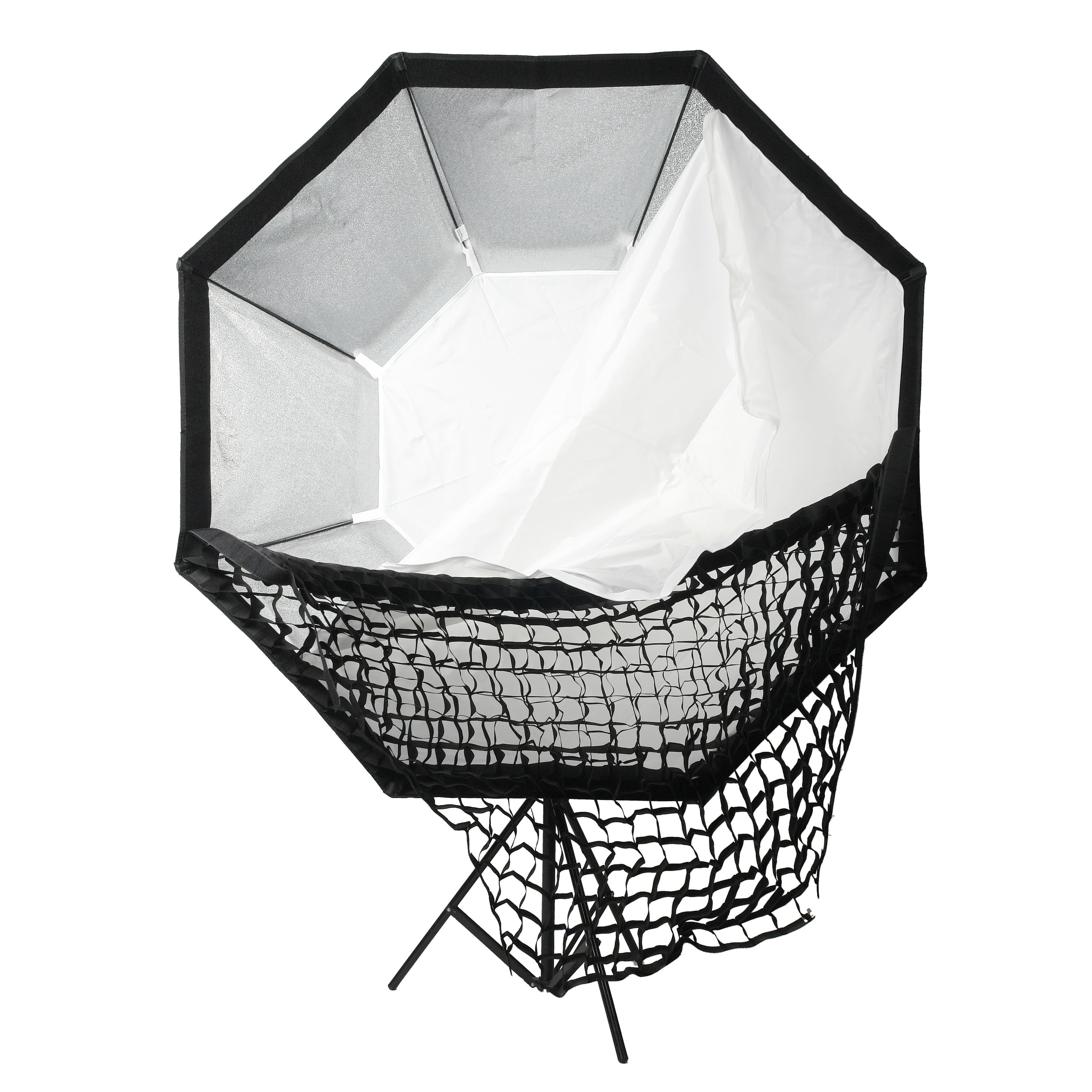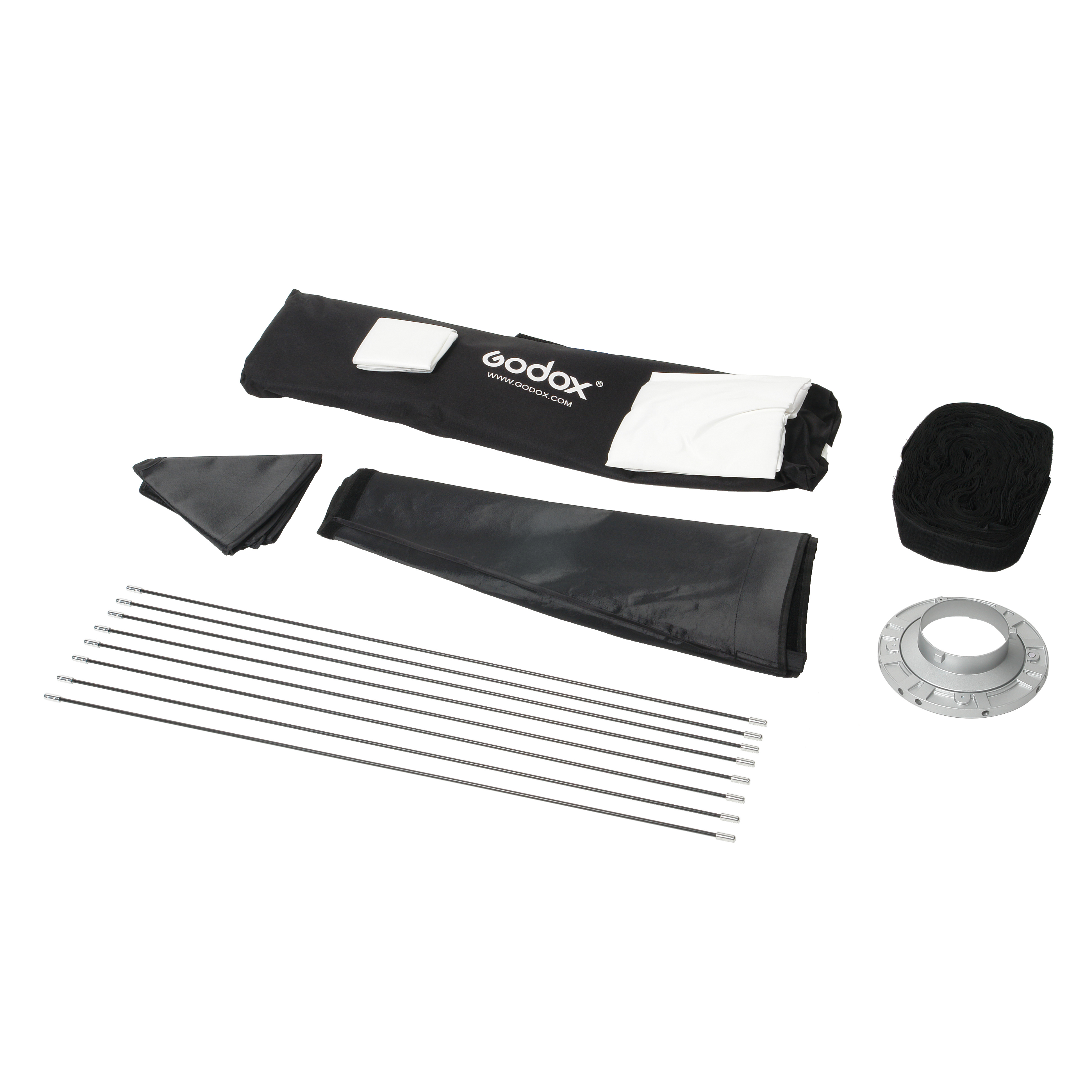 Закрытая конструкция позволяет избежать нежелательных бликов и потерь светового потока. Отражатель, с серебристой тканью внутри, обеспечивает равномерную засветку рассеивателя, который в свою очередь, благодаря большой поверхности, смягчает формируемые тени. Дополнительный внутренний диффузор улучшает равномерность светового потока. Наконечники на упругих металлических спицах не повреждают тканевые держатели софтбокса и облегчают сборку конструкции.