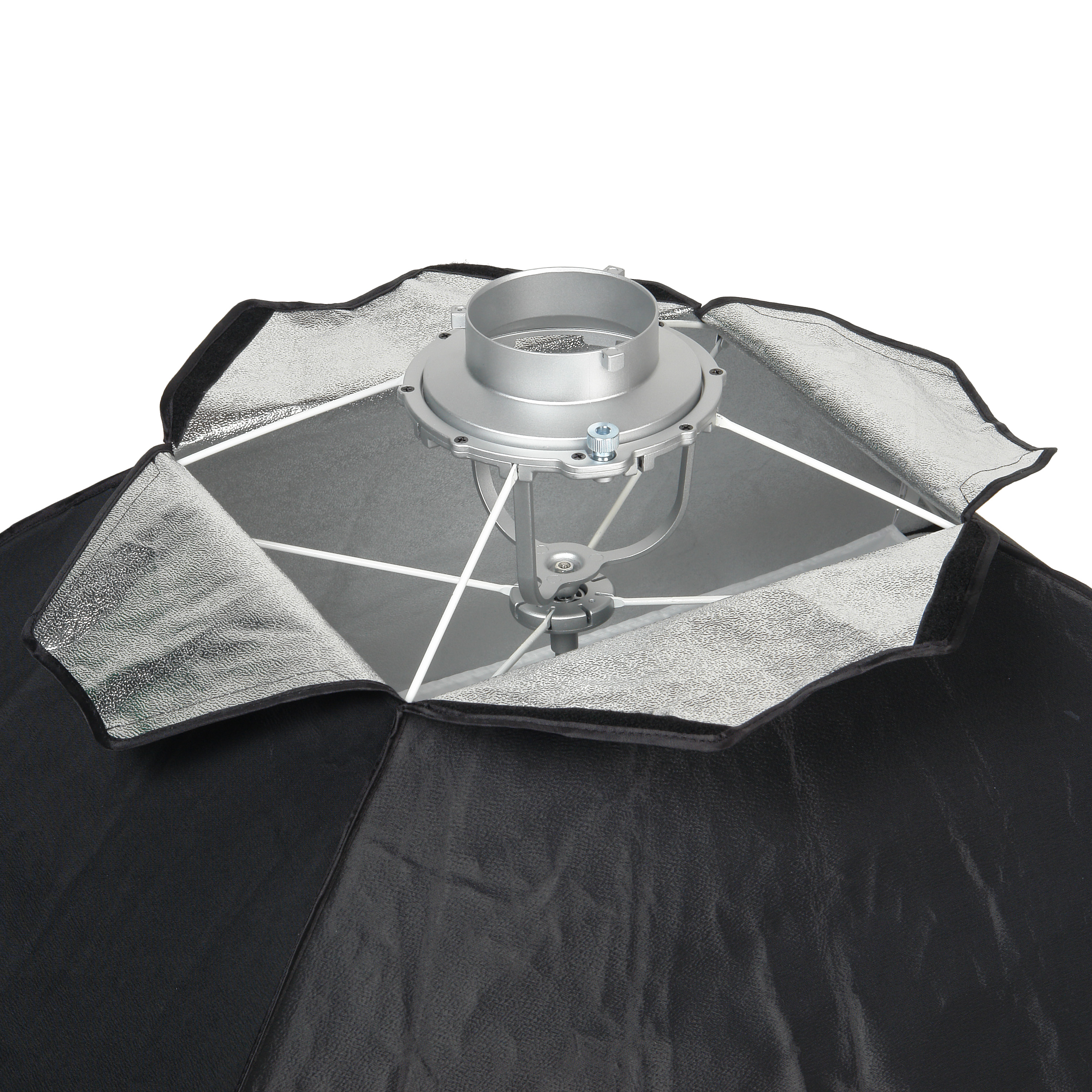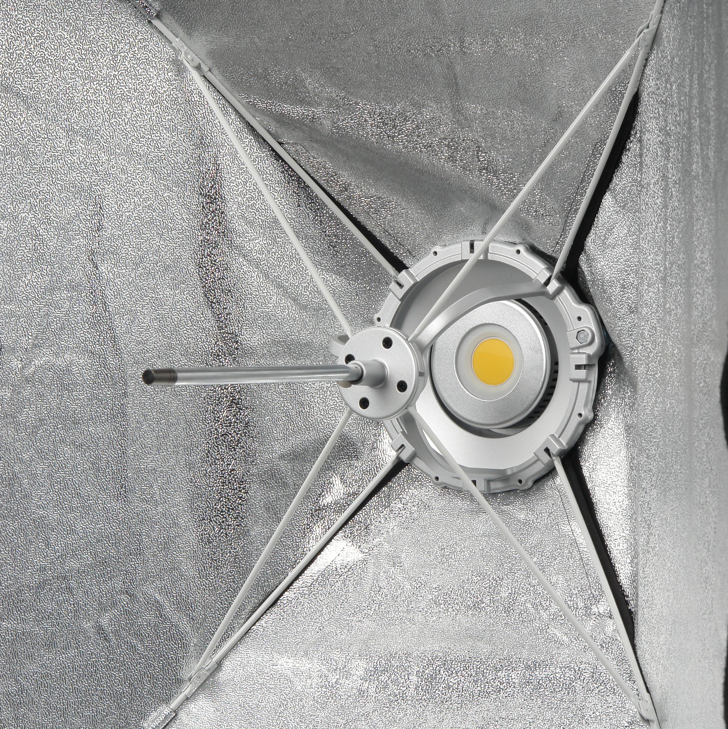 Внутренняя серебристая фактурная поверхность обеспечивает равномерное распределение света внутри софтбокса.