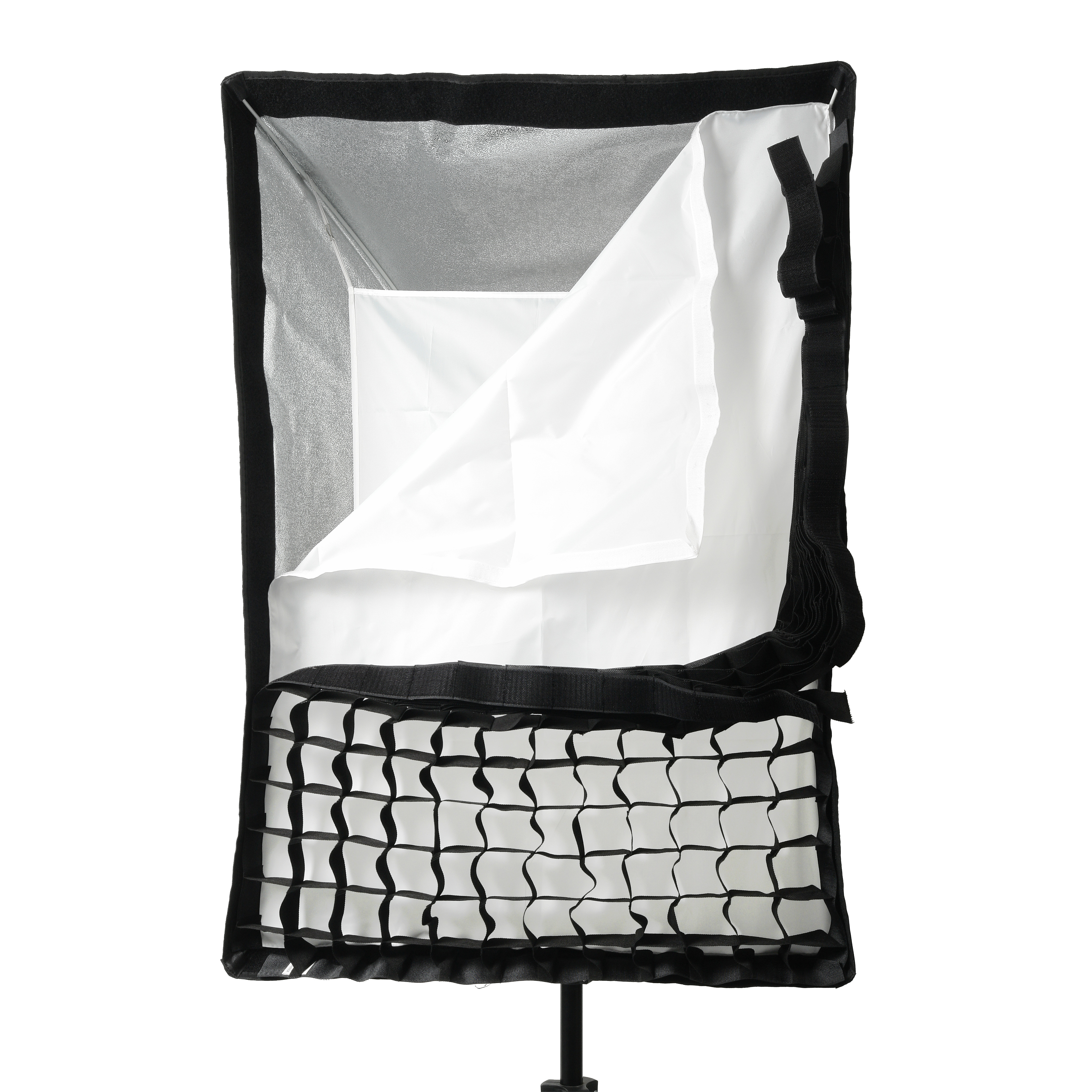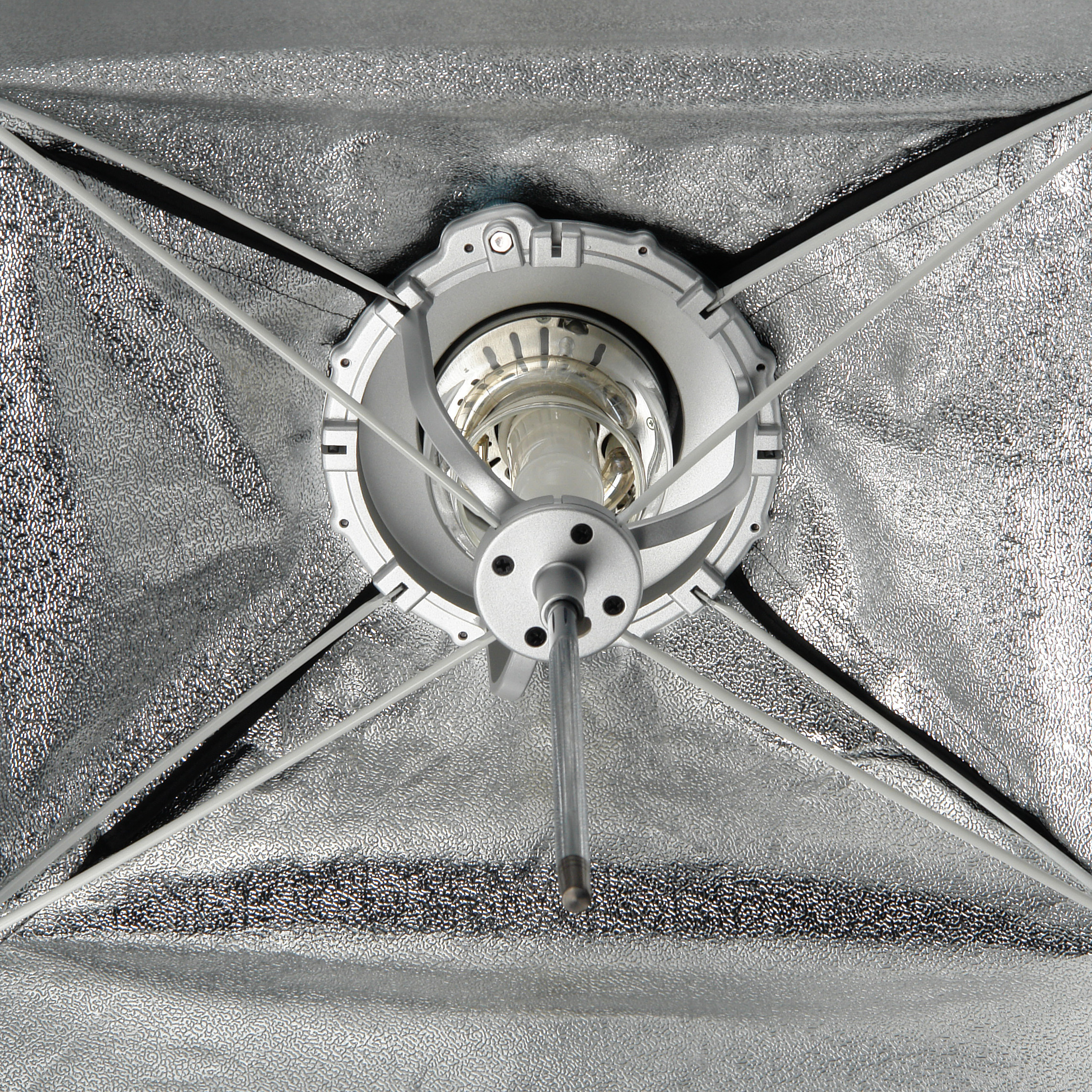 Закрытая конструкция исключает паразитные блики и потери светового потока. Отражающая серебристая поверхность обеспечивает равномерное распределение света внутри софтбокса, белые полупрозрачные рассеиватели делают свет более мягким.