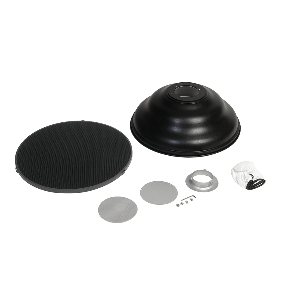 Регулируемый дефлектор устанавливается в двух положениях, что позволяет выбирать результат действия тарелки. С дополнительным нейлоновым диффузором можно получить отличный инструмент для бестеневой предметной съемки. Также, установив перфорированный диффузор, можно добавить немного прямого света к мягкому отраженному от стенок и получить дополнительные возможности для работы на открытом воздухе при ярком солнечном свете.