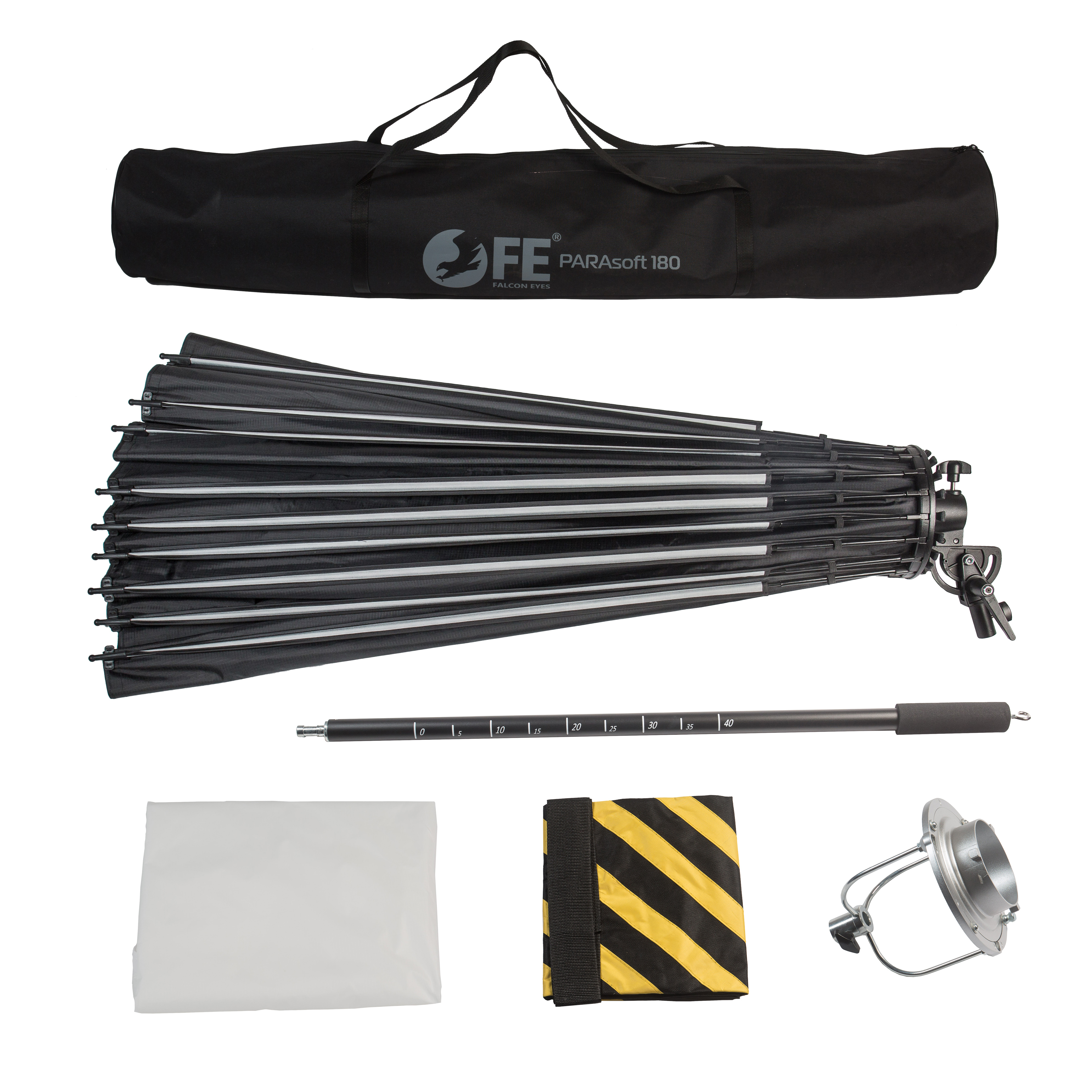 Зонт-отражатель Falcon Eyes PARAsoft 180 – сверхбольшой параболический рефлектор диаметром 1800 мм. Помимо отражателя с наклонным кронштейном, в комплект входят фокусировочная штанга, адаптер для вспышек с байонетом Bowens, тканевый рассеиватель, мешок для песка (груз-противовес) и сумка для переноски. Внутренняя серебристая поверхность рефлектора с высокой отражающей способностью и фокусировочная штанга, помогают формировать яркое освещение с настраиваемым углом светового потока.