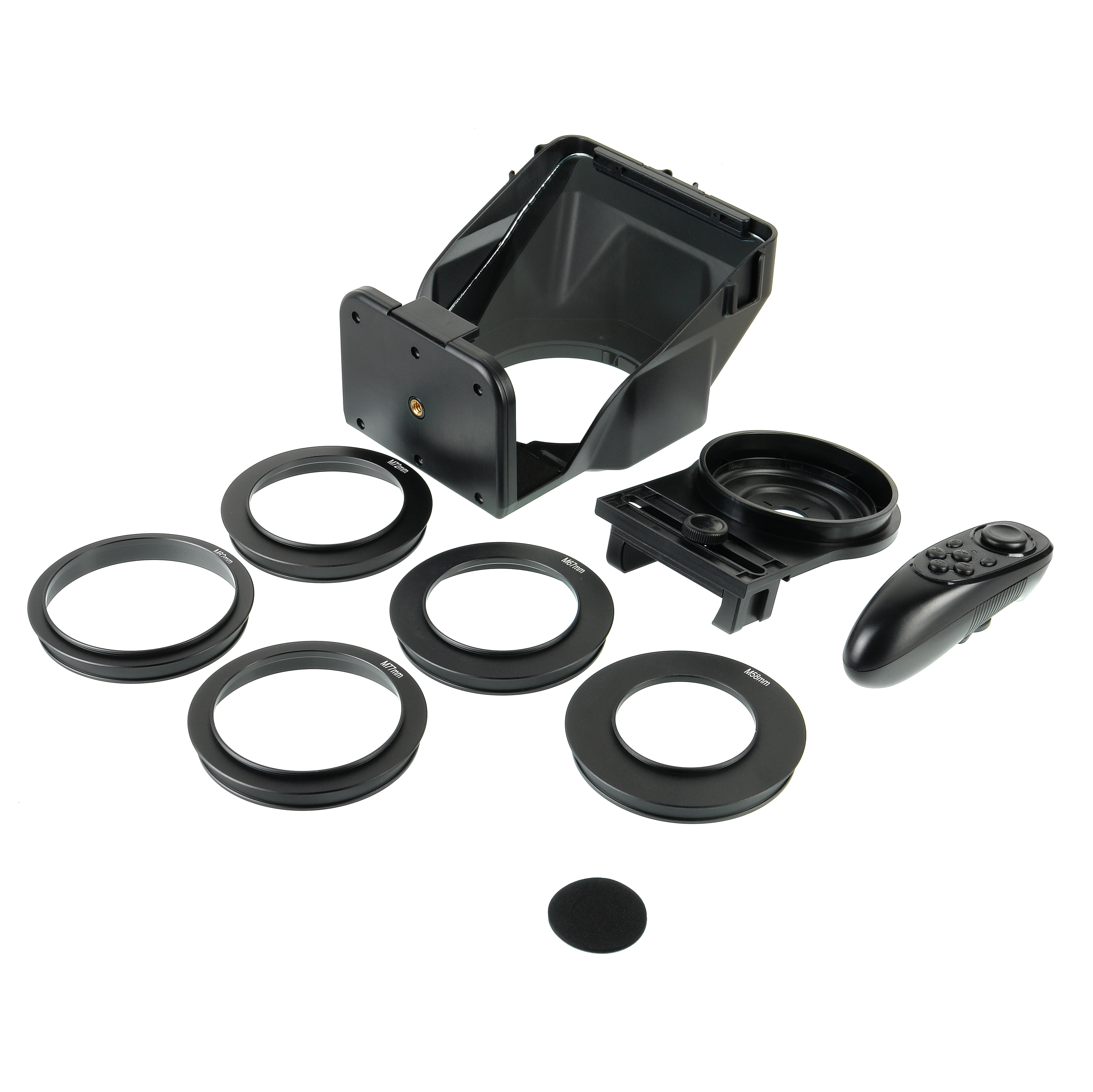Для съемки камерофоном (смартфоном с хорошей камерой) установите корпус суфлера на штатив или риг с винтом 1/4" и используйте пластиковый переходник с держателем для установки камерофона шириной до 80 мм, совместив его камеру с отверстием.