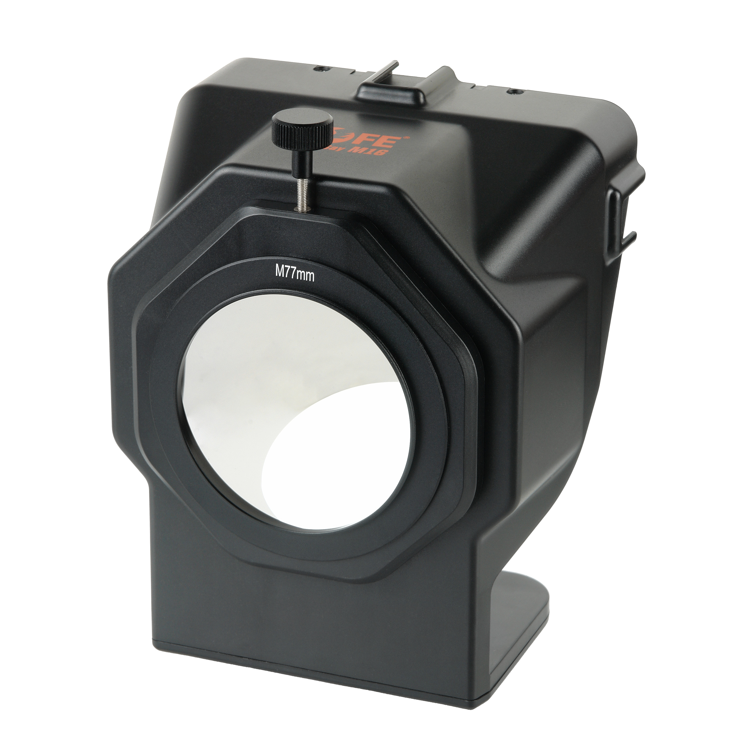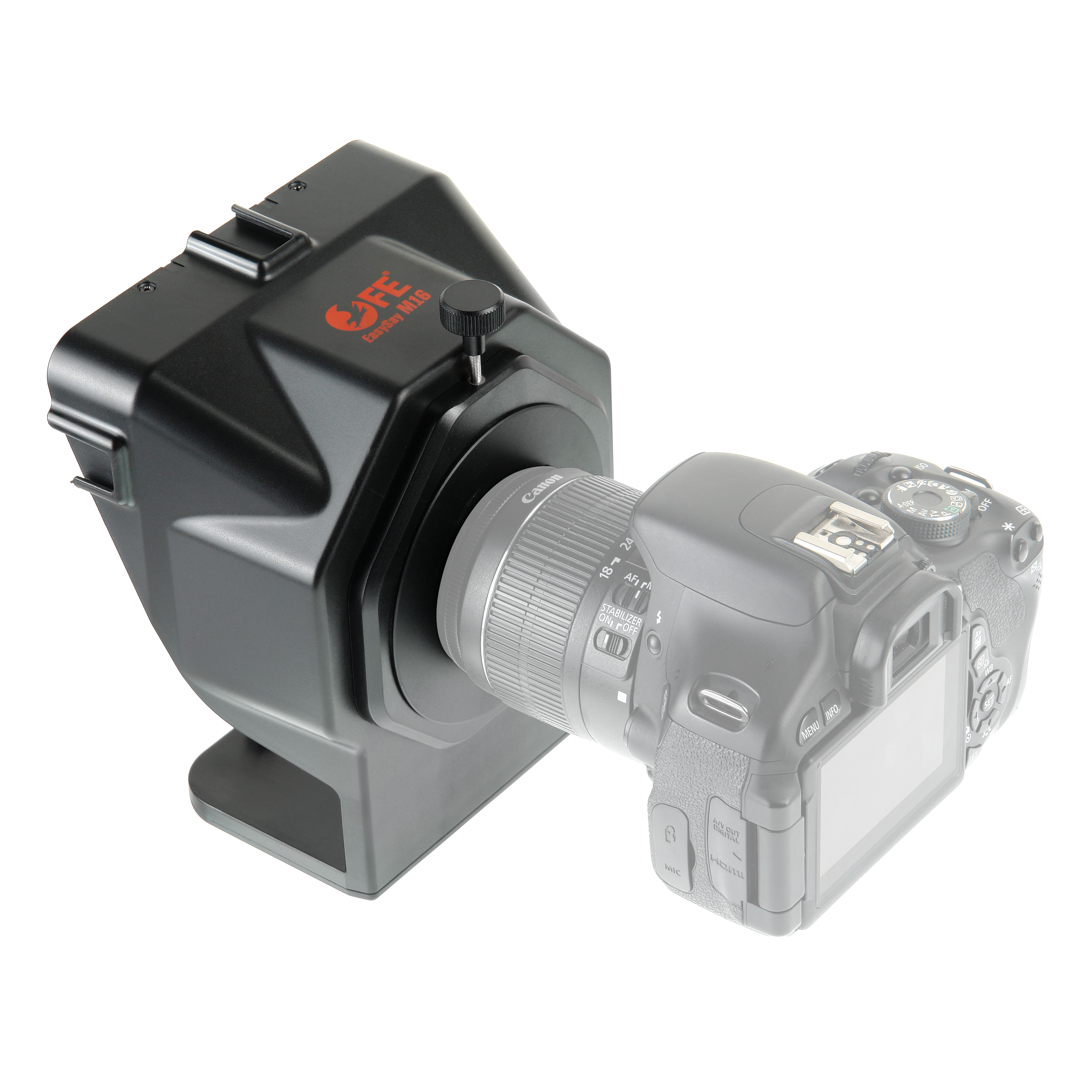 Для съемки цифровой DSLR камерой телесуфлер закрепляется на ее объективе с помощью одного из переходных колец (Ø58, 67, 72, 77, 82 мм в комплекте). Переходное кольцо накручивается на резьбу объектива установленной на штатив камеры, затем на кольце закрепляется фиксирующим винтом корпус телесуфлера. Легкую конструкцию из телесуфлера и камеры можно установить на видеоштатив при помощи штатной резьбы фотоаппарата.