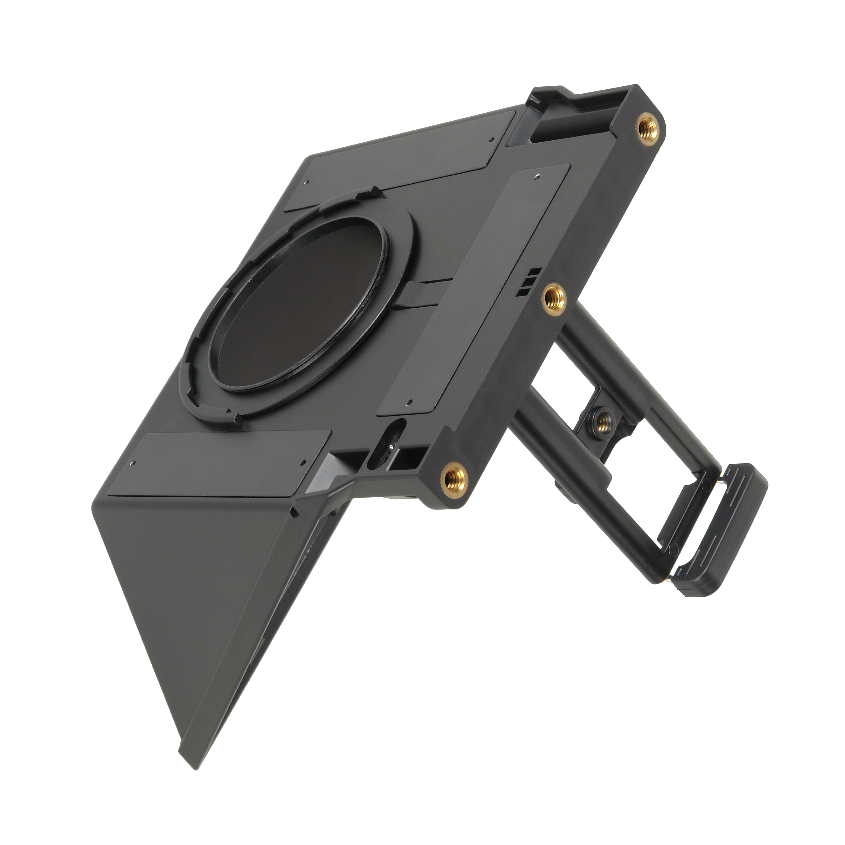 Легкую конструкцию из телесуфлера и камеры можно установить на видеоштатив при помощи штатной резьбы фотоаппарата. Также можно дополнительно закрепить телесуфлер на риг или другое основание, для этого снизу телесуфлера есть резьбовые отверстия 1/4".
