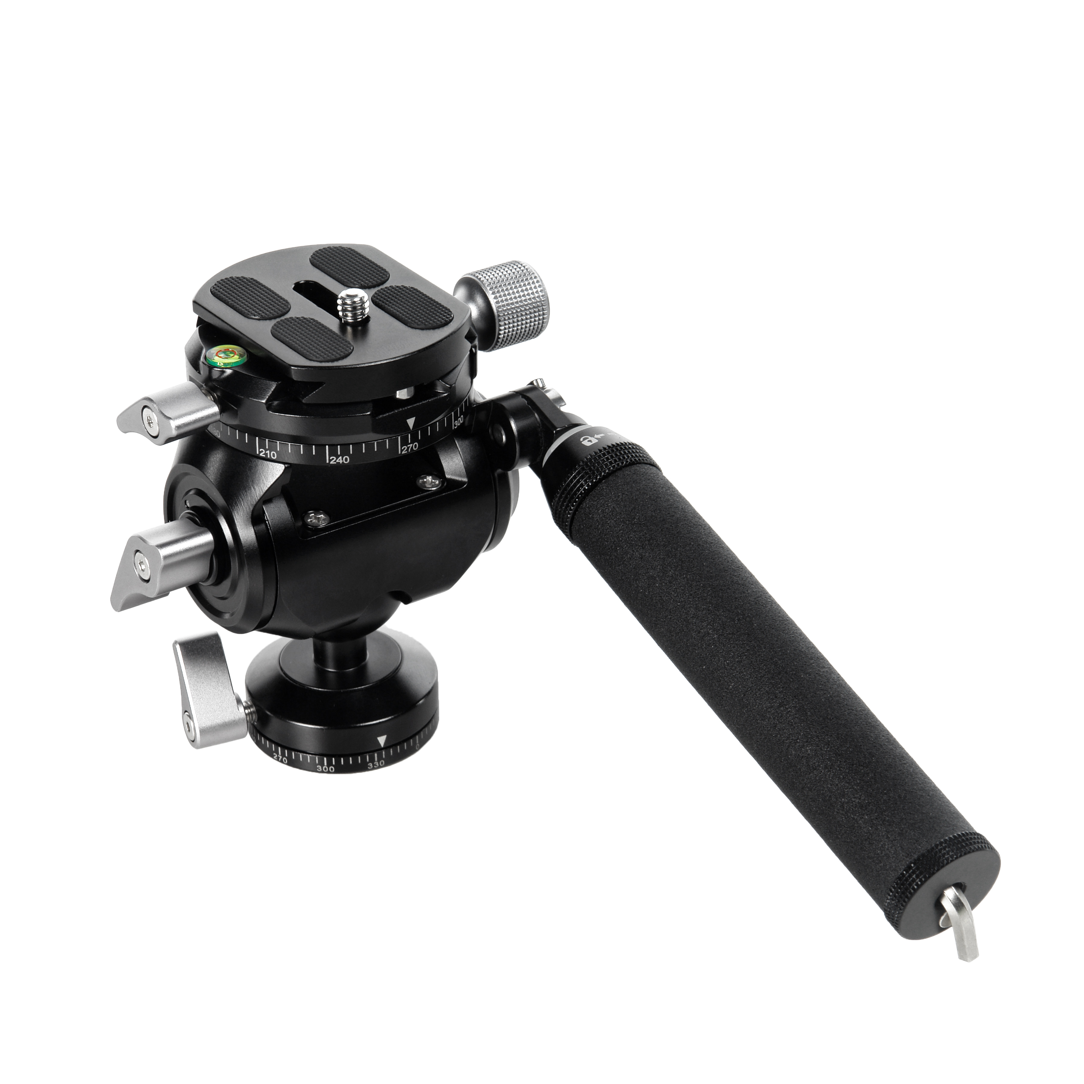 Жидкостная шаровая головка с низкопрофильной конструкцией благодаря большому диаметру шара сводит к минимуму смещение тяжелой камеры при изменении наклона. Благодаря наличию пузырькового уровня и угловой шкалы можно с высокой точностью отрегулировать положение камеры на штативе.