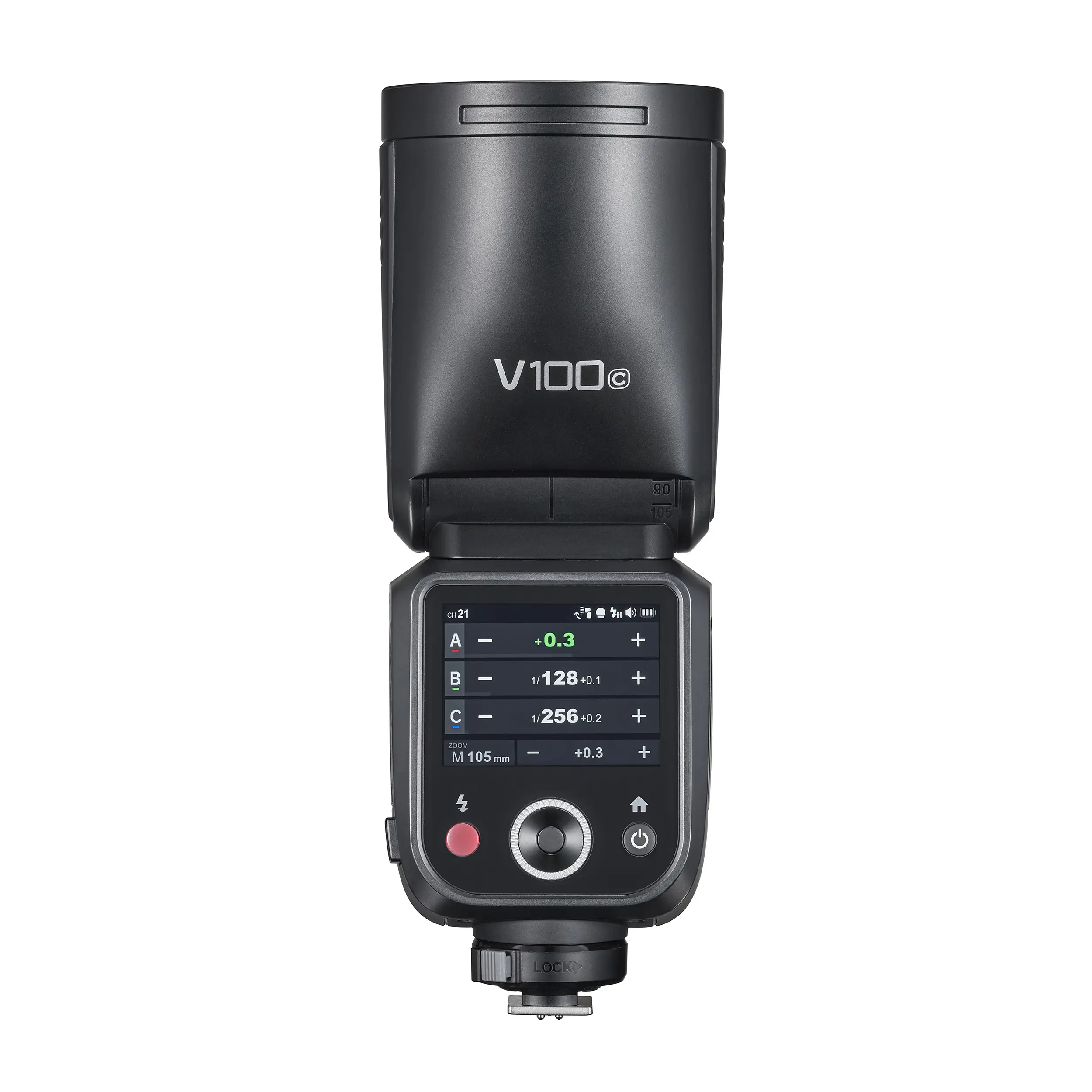 Интерфейс вспышки V100 характеризуется высокой отзывчивостью благодаря наличию большого 2,3-дюймового цветного сенсорного экрана с высоким уровнем чувствительности.