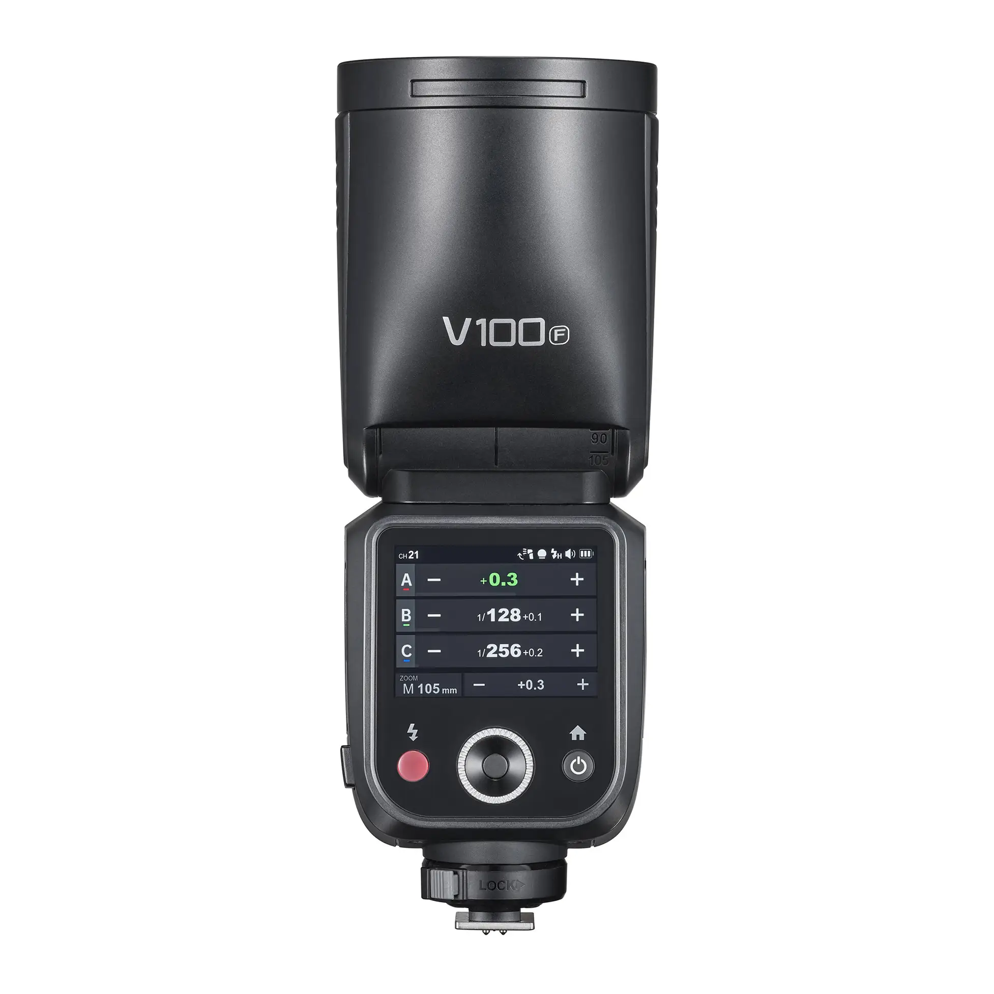 Godox V100F – накамерная вспышка с TTL-режимом управления, сенсорным экраном и питанием от литий-ионного аккумулятора с разъемом USB-C. Она задает новый стандарт для профессионалов, впервые предоставляя мощность 100 Дж в компактном накамерном исполнении.