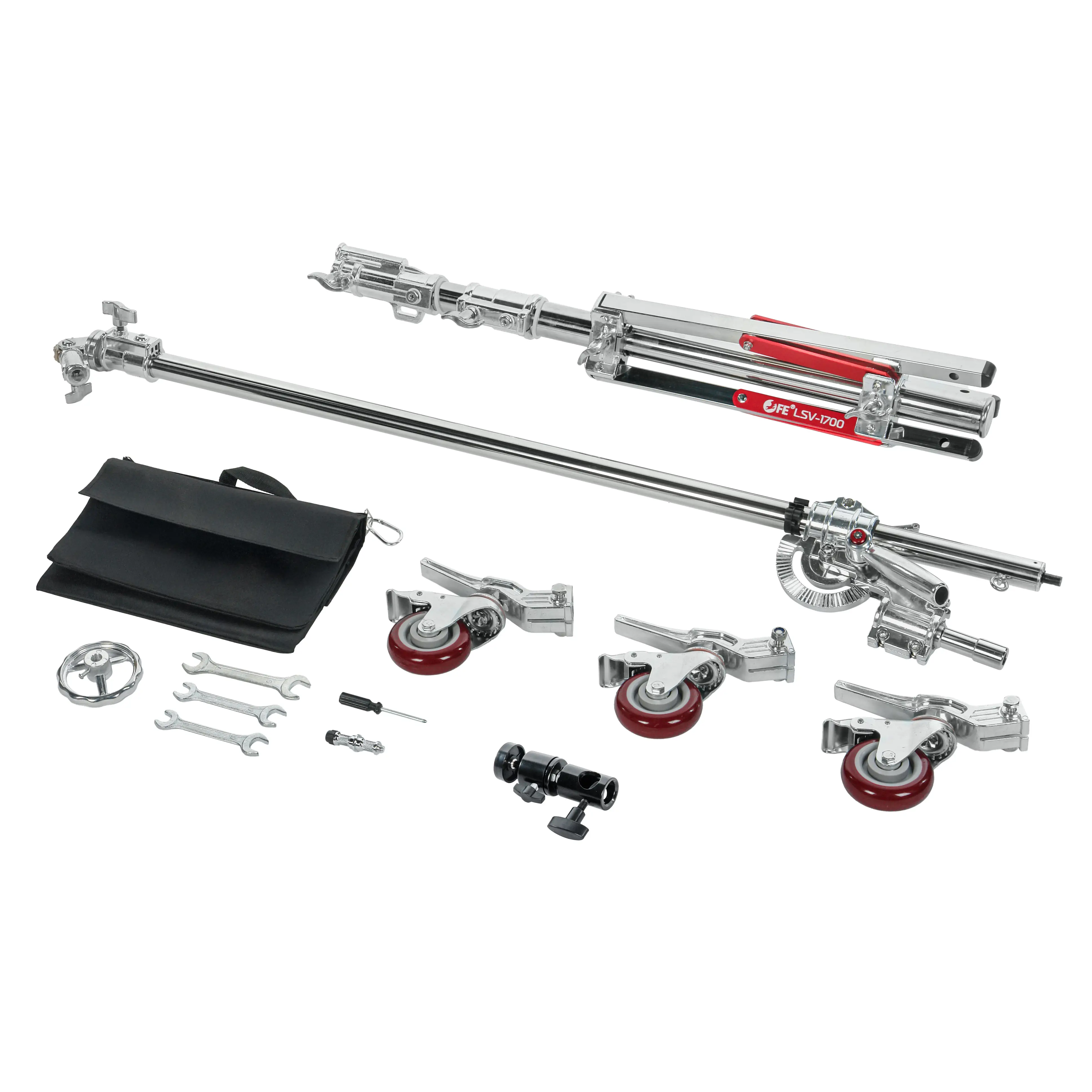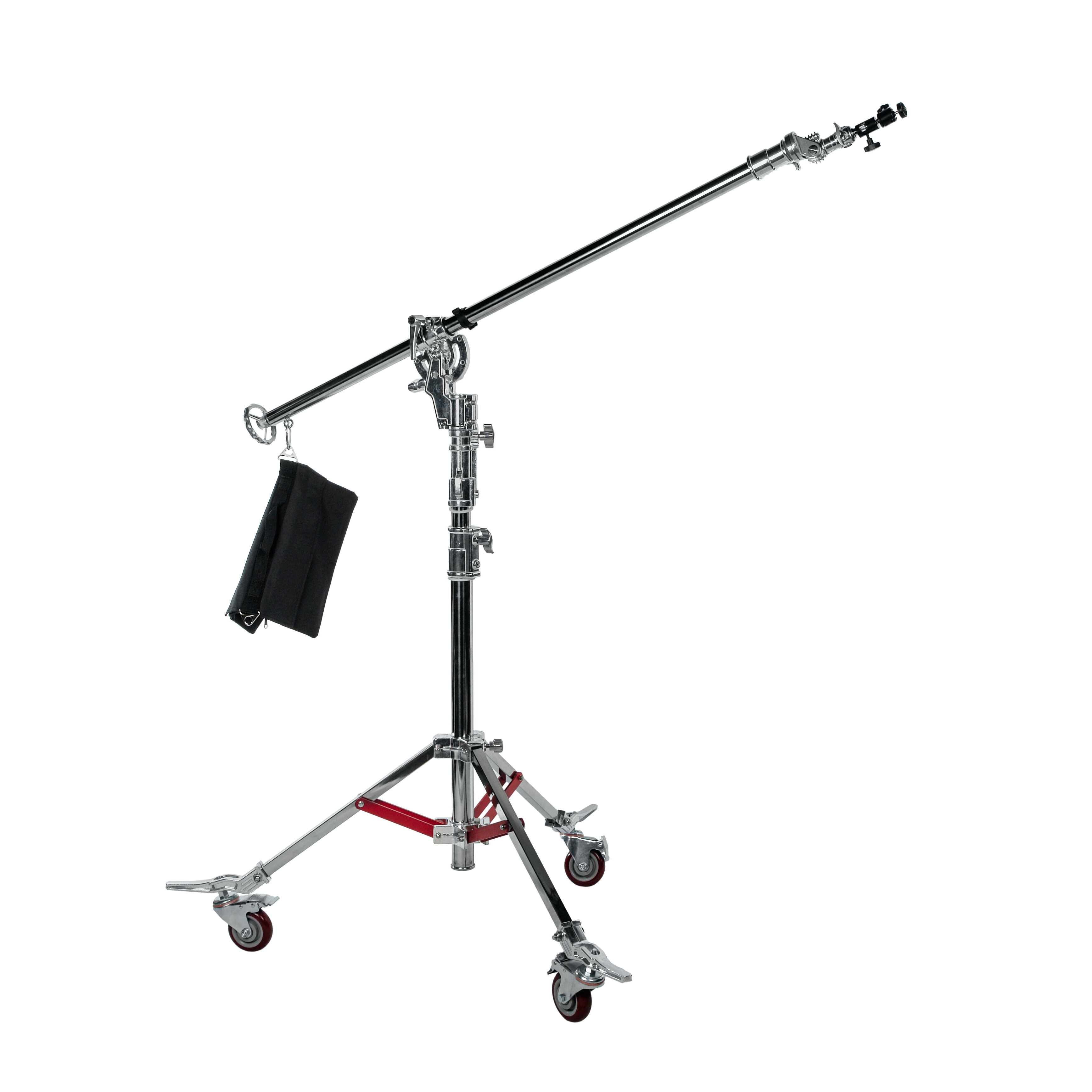 Конструкция стойки с телескопической центральной колонной, стальной треногой основания и телескопической перекладиной способна выдержать нагрузку до 15 кг. Для удобства перемещения по площадке тренога оснащена съемными колесами.