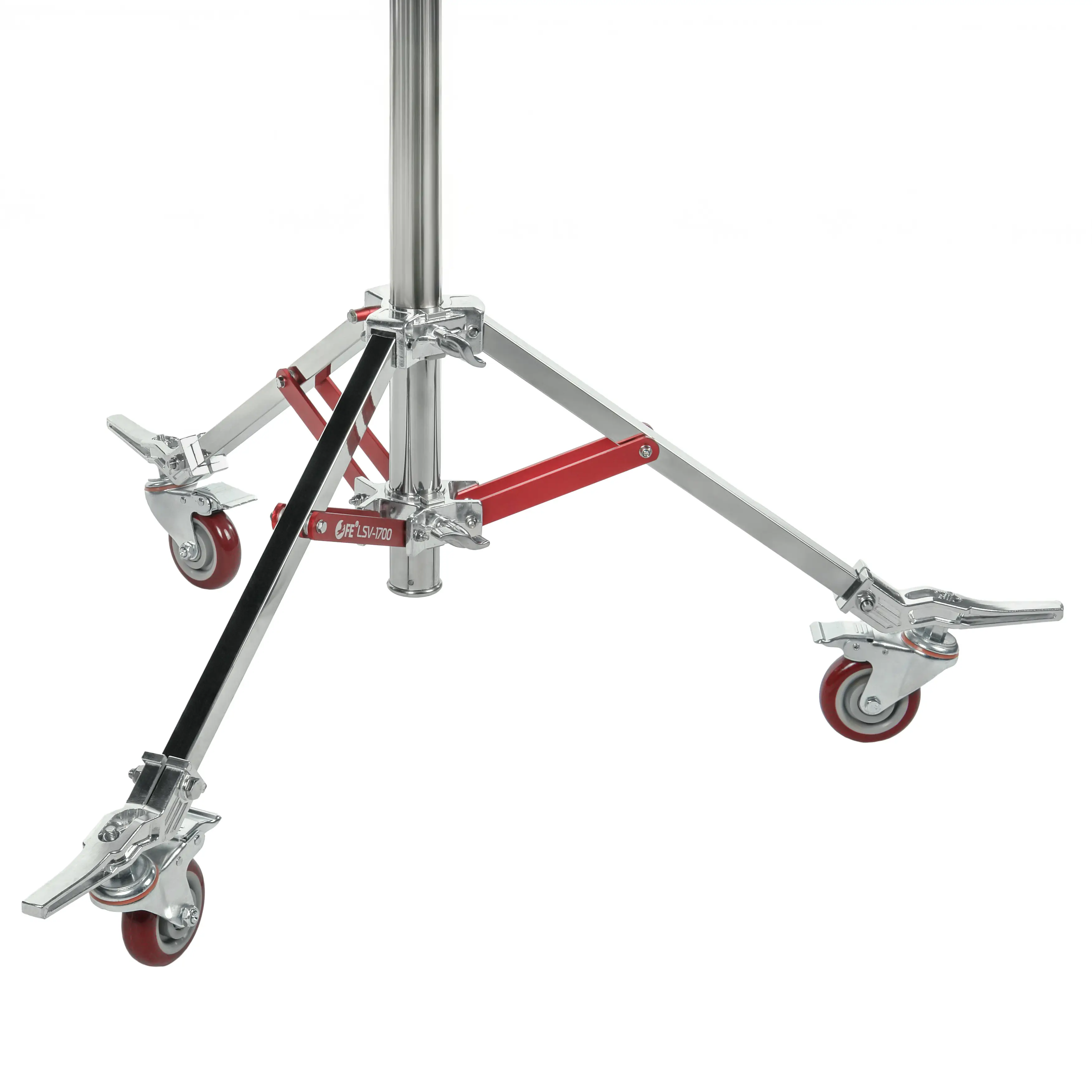 Тренога комплектуется тремя съемными колесами диаметром 100 мм с возможностью поворота на 360 градусов, что позволяет легко менять направление движения при перемещении оборудования. Ножные тормоза блокируют ролики и фиксируют стойку в нужном положении.