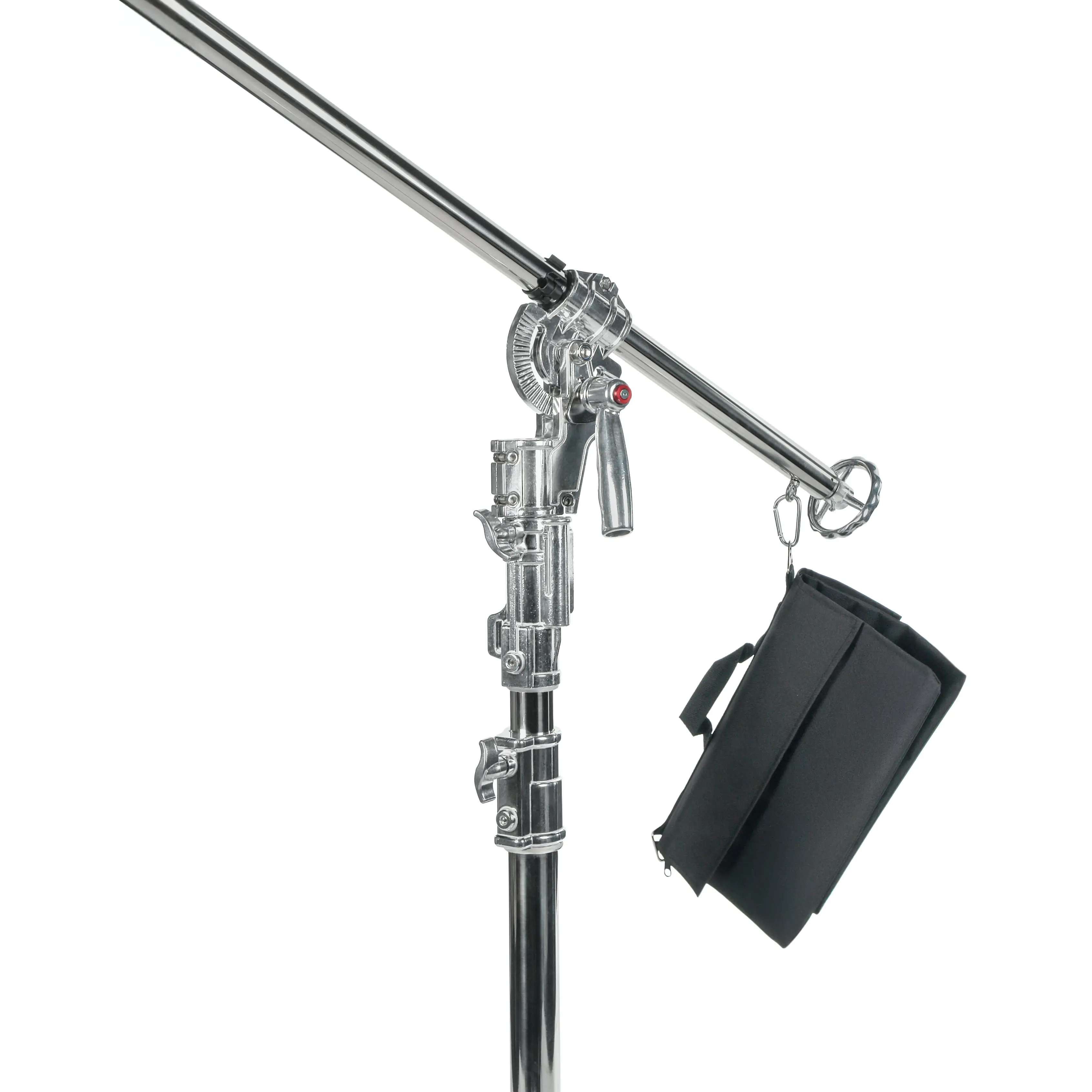 Комплект поставки включает прочный тканевый мешок для утяжеления конструкции песком. Его можно разместить на опорах треноги или закрепить на конце горизонтальной перекладины, повышая устойчивость системы при работе с тяжелым оборудованием.