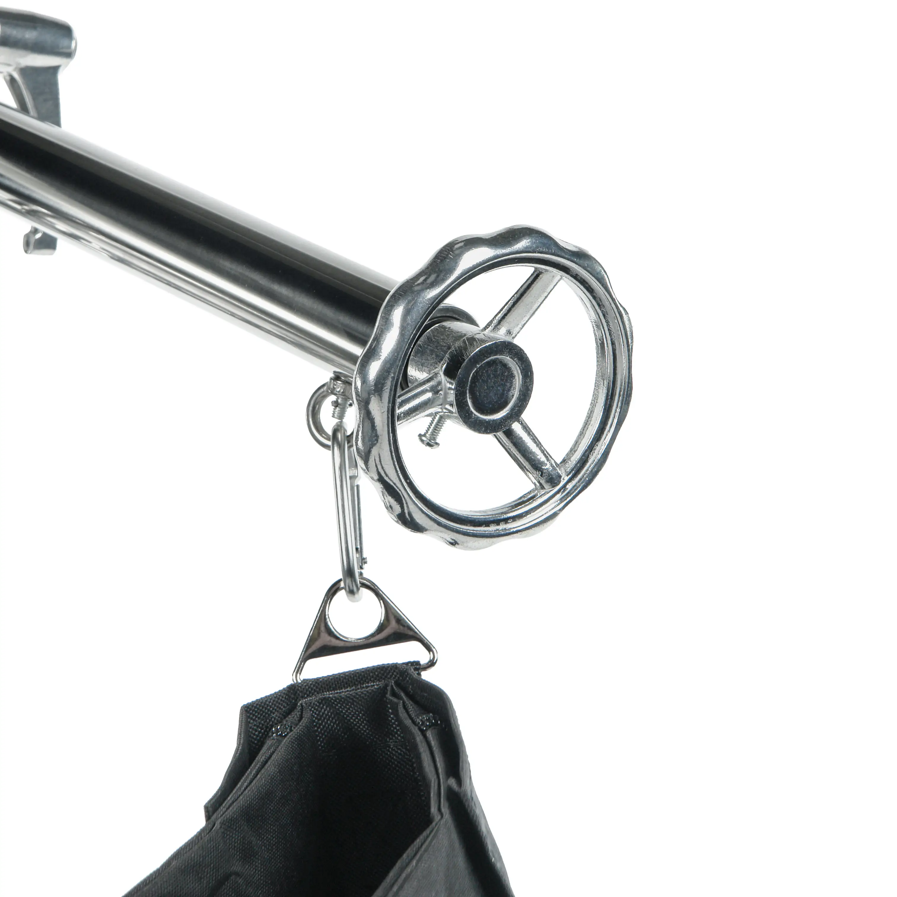 Важной особенностью конструкции является наличие поворотной муфты-держателя с надежным храповым замком. Этот механизм гарантирует жесткую фиксацию перекладины в любом выбранном положении, исключая риск случайного перемещения или провисания даже при значительных нагрузках.