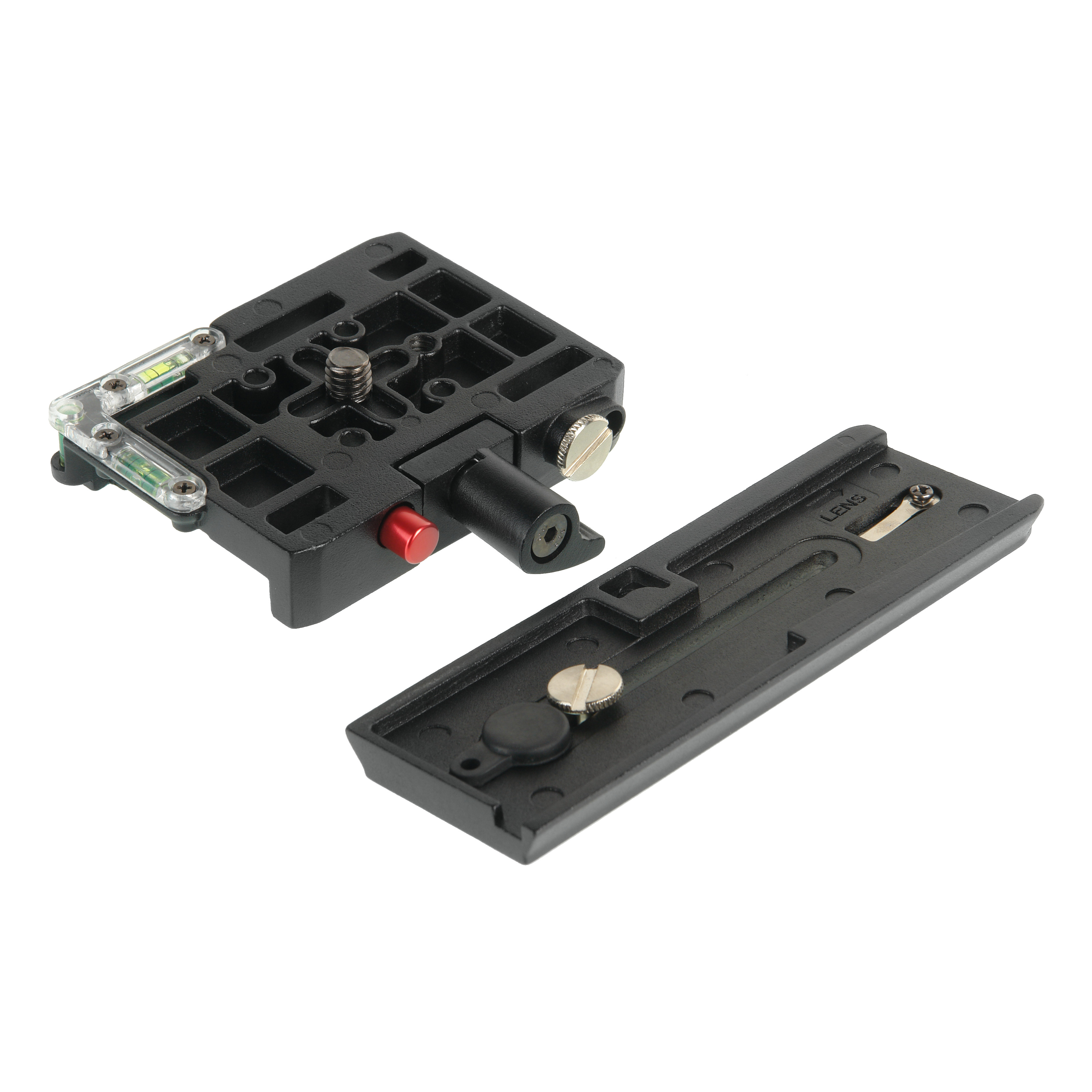 Стопорный винт с защитой от скручивания поджимает фиксатор положения быстросъемной площадки. Расположенная рядом красная кнопка освобождает быстросъемную площадку от дополнительного подпружиненного предохранителя, который защищает площадку от случайного выскальзывания.