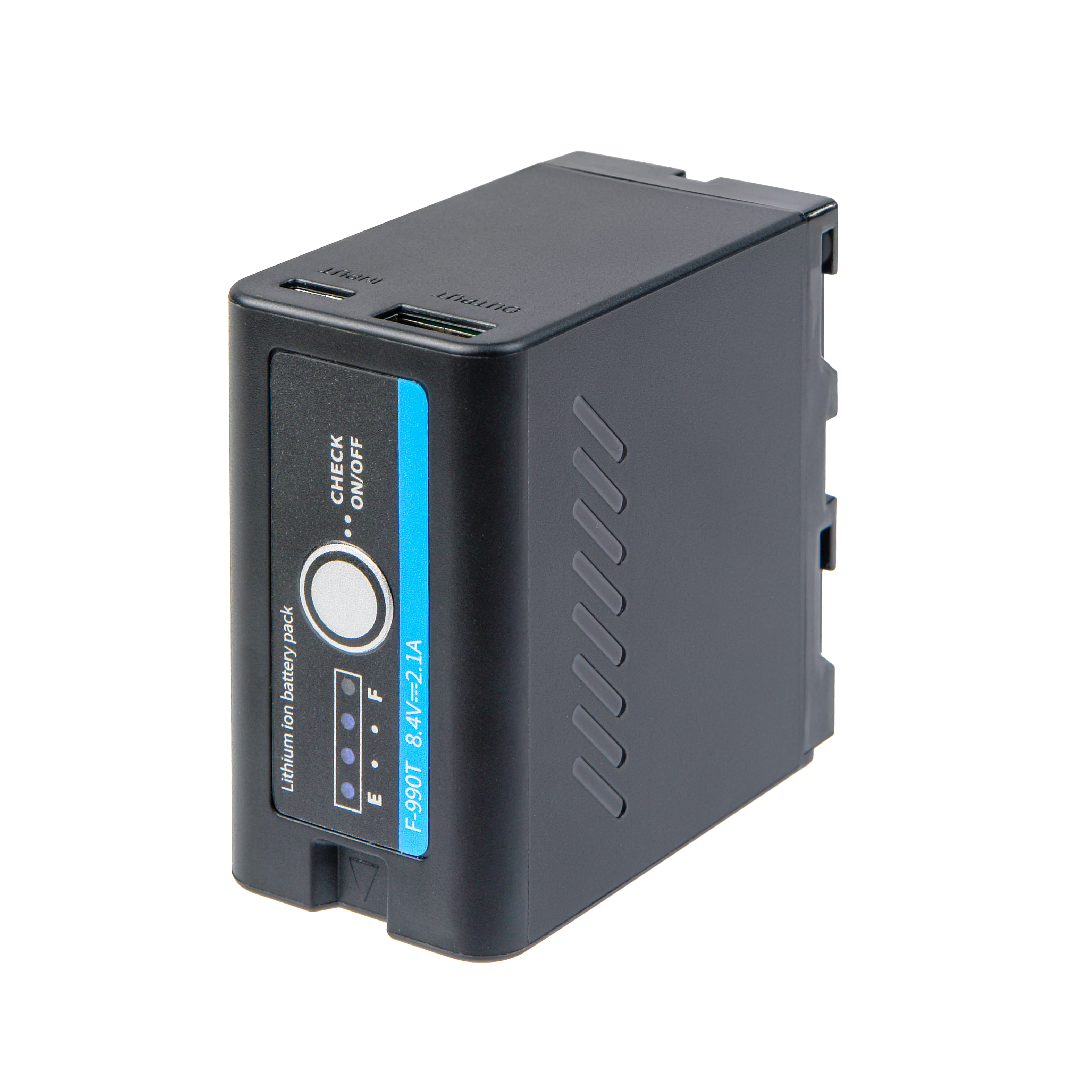 Модель NP-F990 PROII имеет функцию проверки заряда: при нажатии кнопки «Check» четыре светодиодных индикатора показывают уровень заряда батареи.