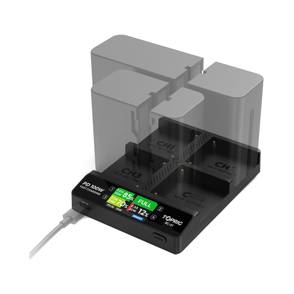 Accsoon TOPRIG BC01 4-Bay NP-F – четырехканальное зарядное устройство, разработанное для аккумуляторов типа NP-F. Оно помогает обеспечить высокую производительность, безопасность и длительную работу съемочного, осветительного и иного оборудования.