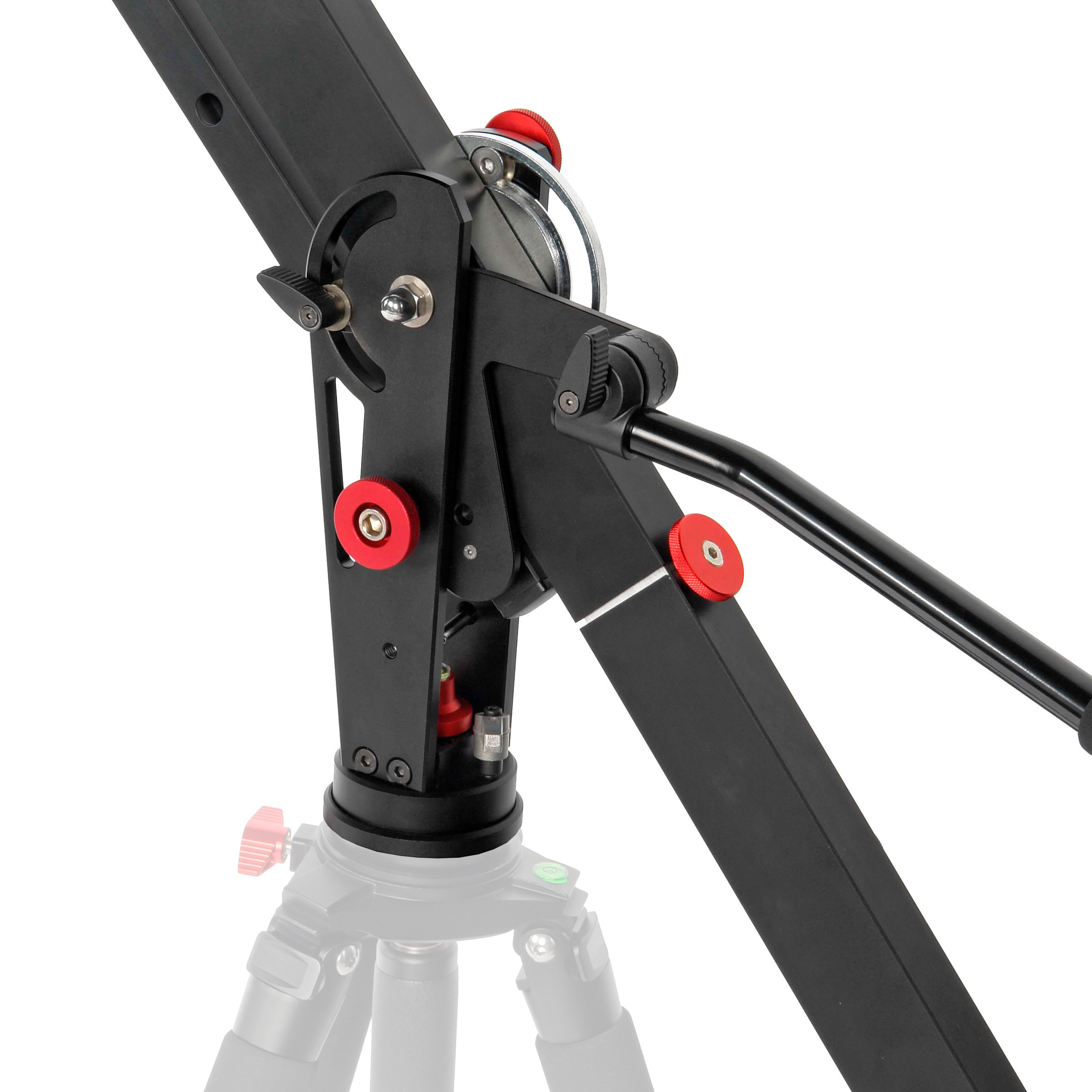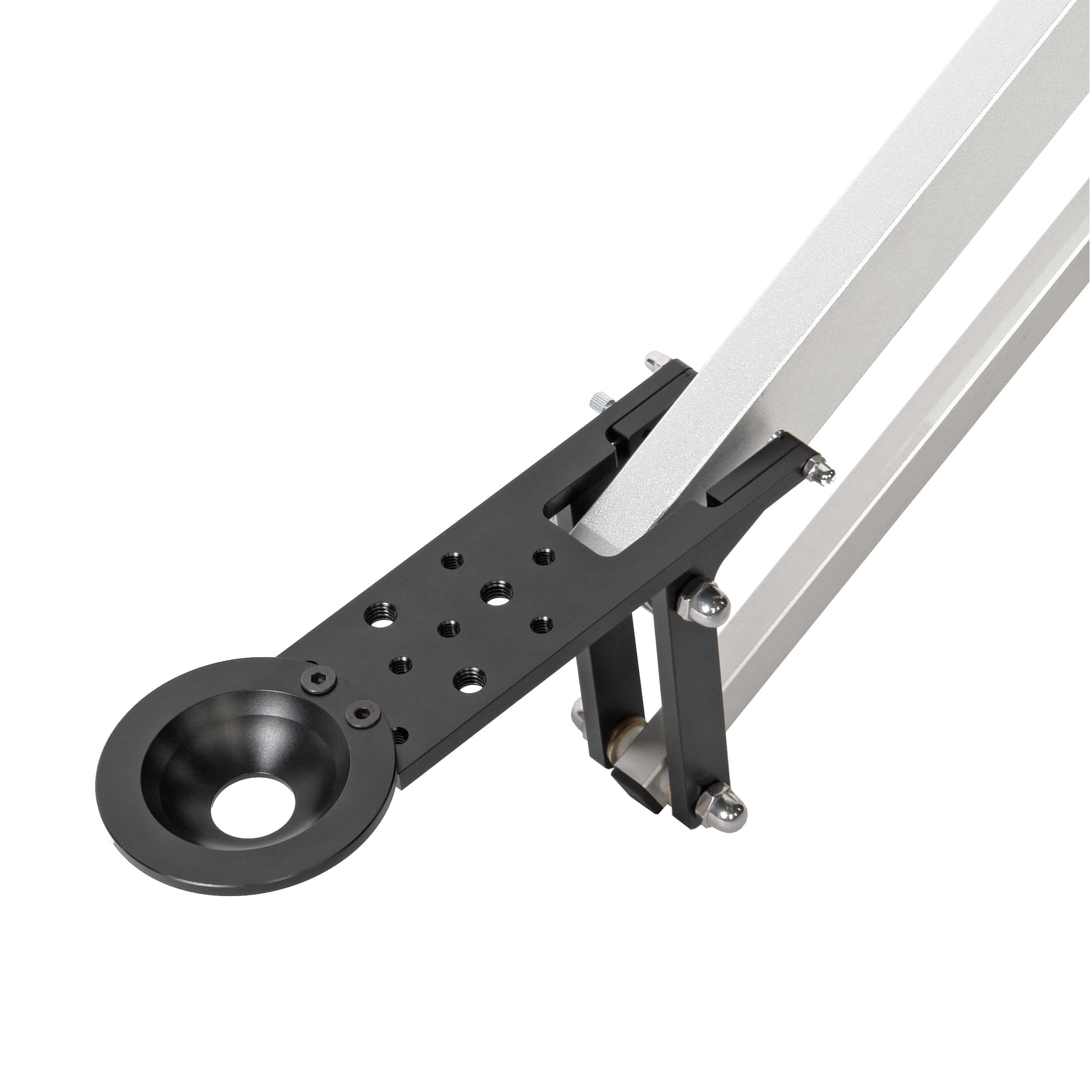 Основание крана представляет собой поворотный механизм с подшипниками качения, это позволит устанавливать кран на опору с резьбой 3/8" (дополнительно приобретаемые штативы, студийные пьедесталы и т.д.) и производить панорамирование на 360˚, без необходимости покупки дополнительных штативных голов. Винтовые зажимы надежно фиксируют положение поворота и наклона стрелы.