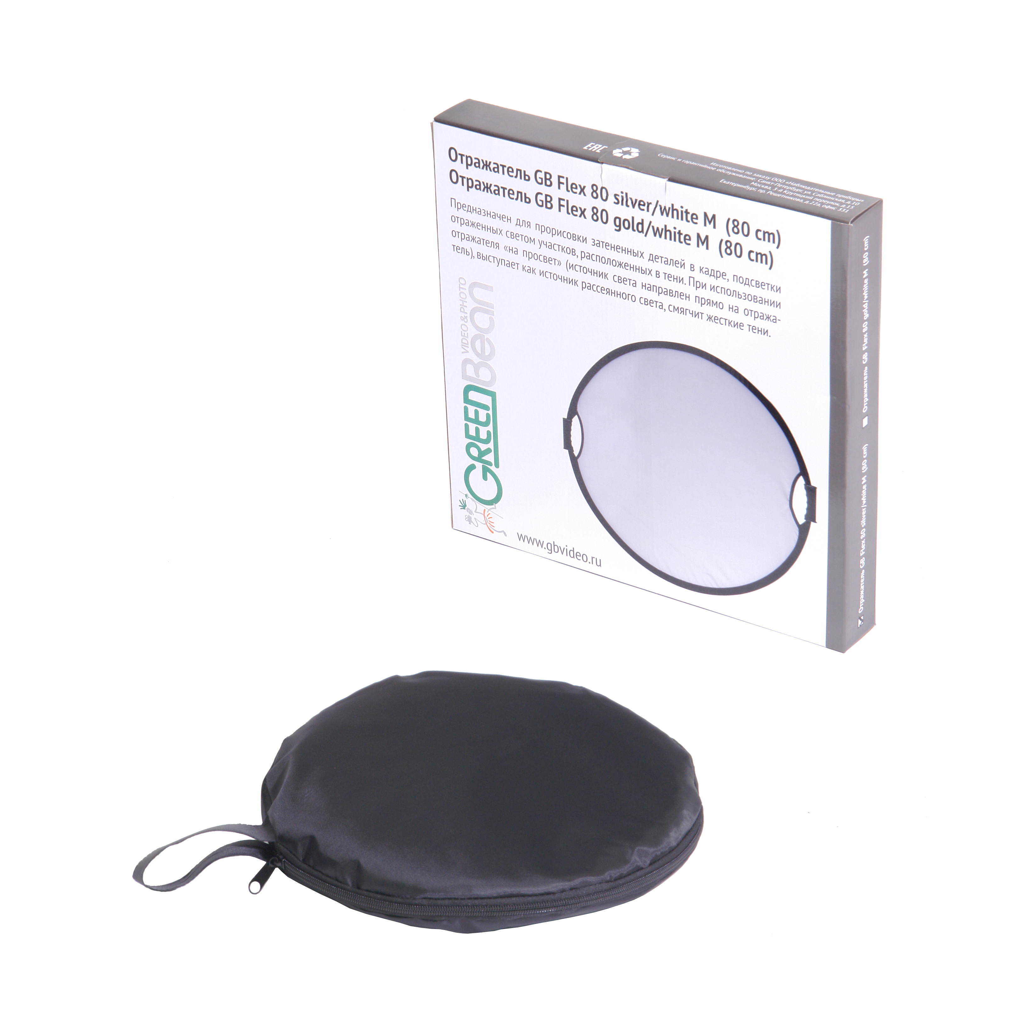 GreenBean GB Flex 80 silver/white L – складной отражатель (рефлектор) на металлическом каркасе. Диаметр 80 см. С одной стороны серебристая поверхность, с другой – белая. Серебристая сторона используется для отражения направленного контрастного света с резкими тенями, белая для рассеянного света с мягкими тенями. Для удобного использования на каркасе находятся две рукоятки.